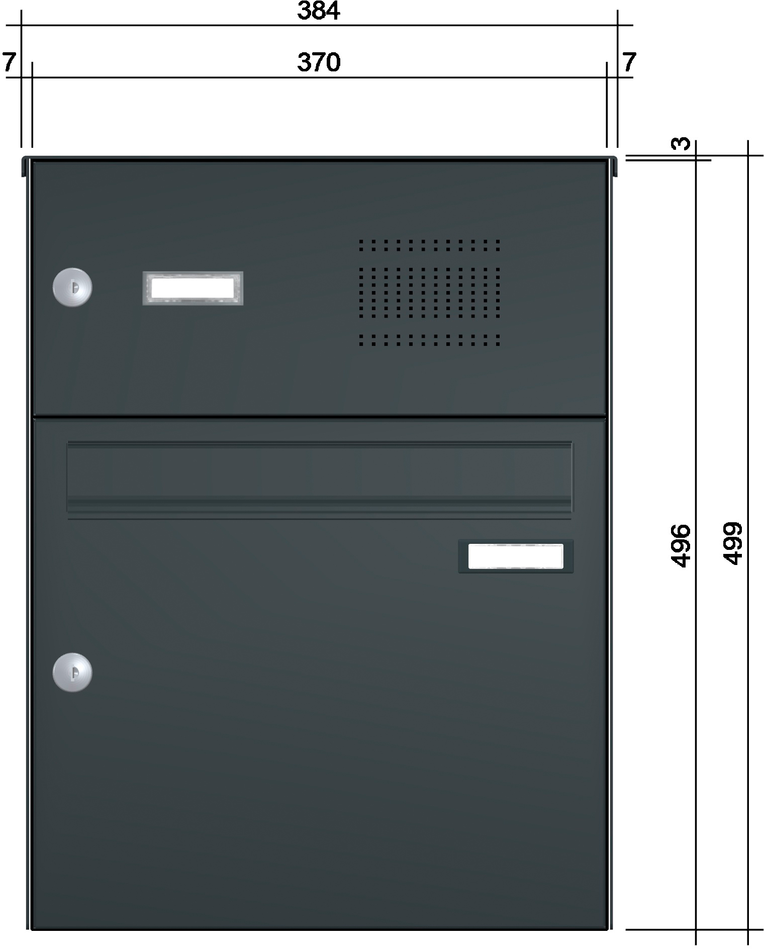 Jeder Briefkasten ist im Kastenmaß von 370x330x100mm (BxHxT)ausgeführt.Einwurfklappen je 325 x 35 mm (BxHxT). Mit eckiger Verkleidung der Briefkästen und Regenabweiser, zum Einsatz der Anlage im ungeschützten Außenbereich.