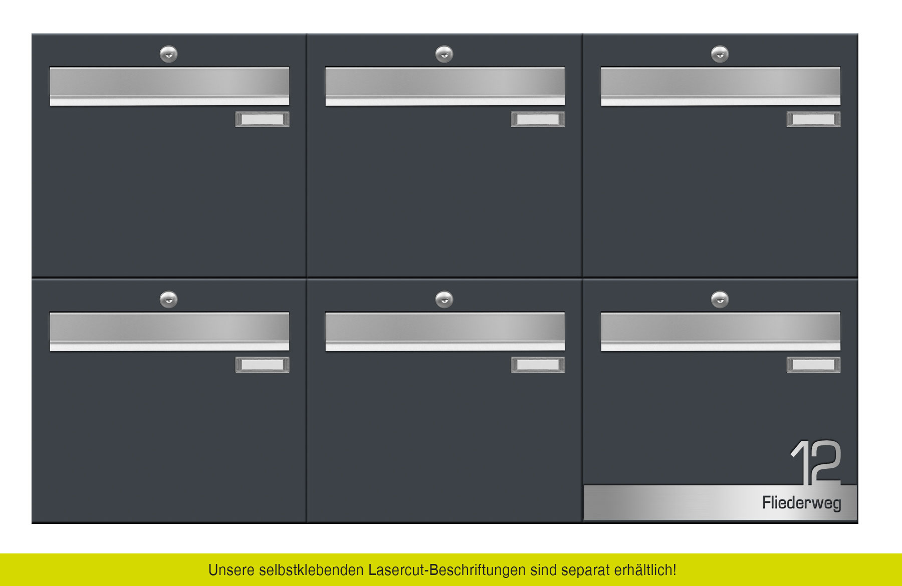 Bei Bedarf können weitere Kästen nachbestellt werden um die Briefkastenanlage zu ergänzen, wie beispielhaft auf dem Bild auf der Hauswand zu sehen. Die Kästen werden einzeln geliefert und können vor Ort dann beliebig neben- oder übereinander montiert werden.