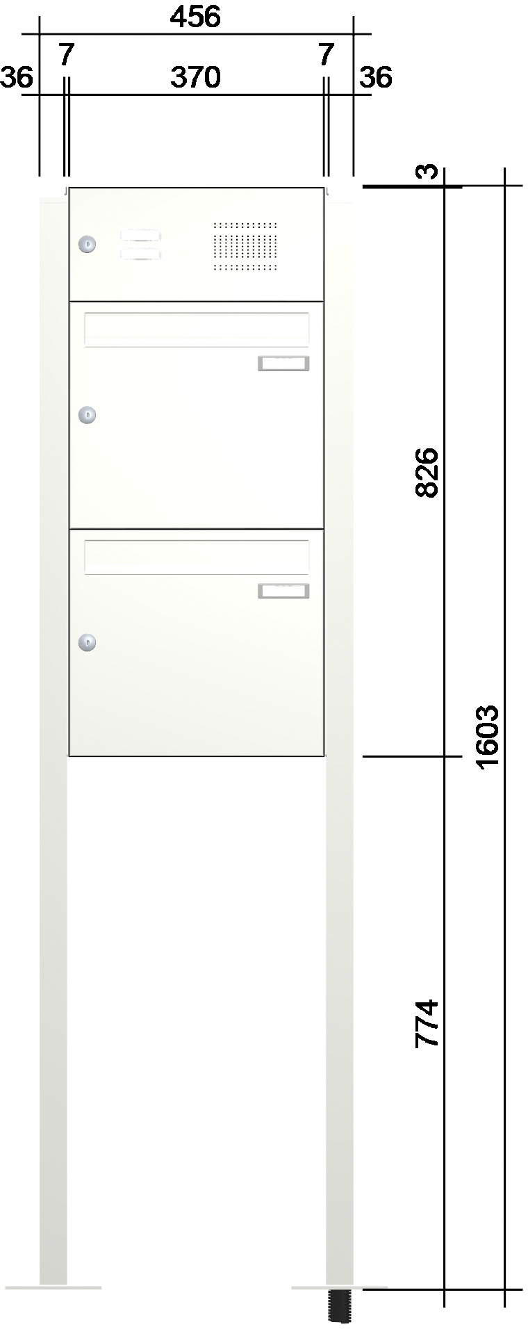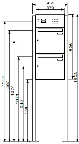 Jeder Briefkasten ist im Kastenmaß von 370 x 330 x 100 mm (BxHxT) ausgeführt. Inkl. eckiger Verkleidung der Briefkästen und Regenabweiser, zum Einsatz der Anlage im ungeschützten Außenbereich. Einwurfklappen je 325 x 35 mm (BxHxT).