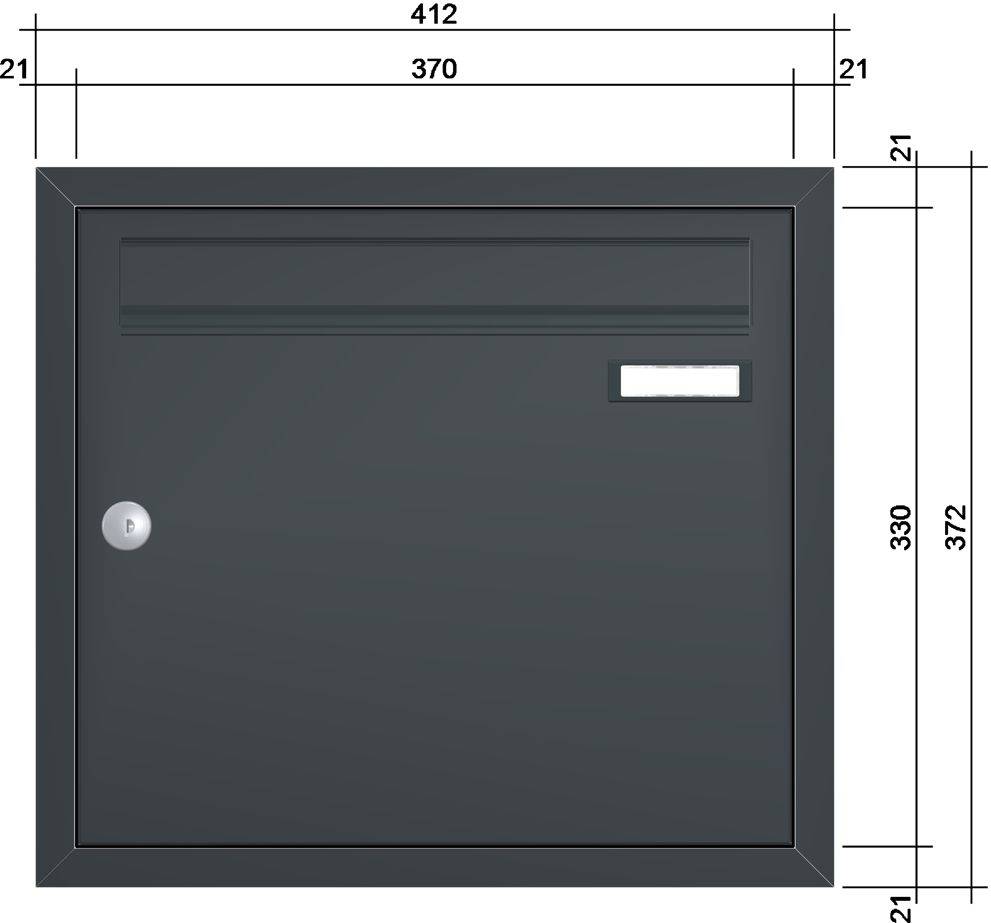 Jeder Briefkasten ist im Kastenmaß von 370 x 330 x 100 mm (B x H x T) ausgeführt. Inkl. umlaufendem Putzabdeckrahmen zum Einsatz der Anlage im ungeschützten Außenbereich. Einwurfklappe 325 x 35 mm (B x H).