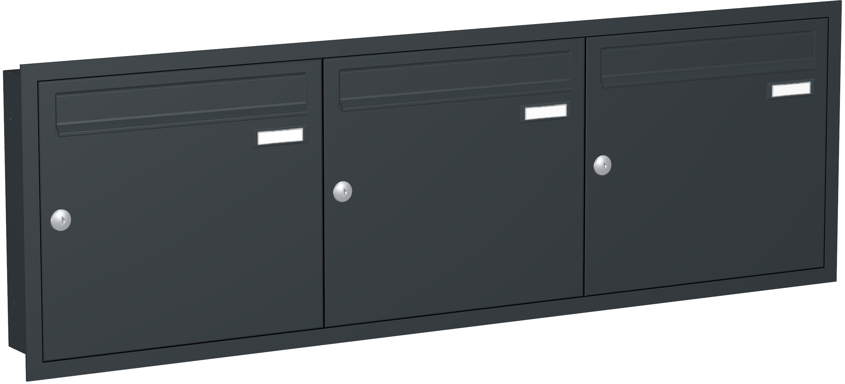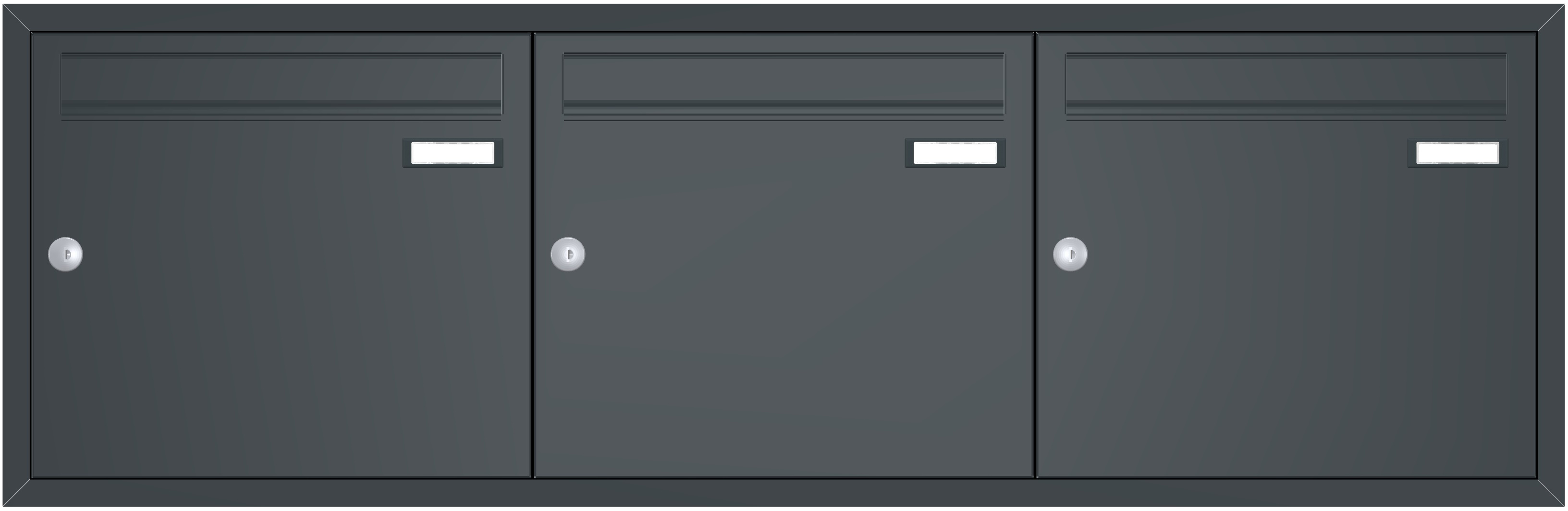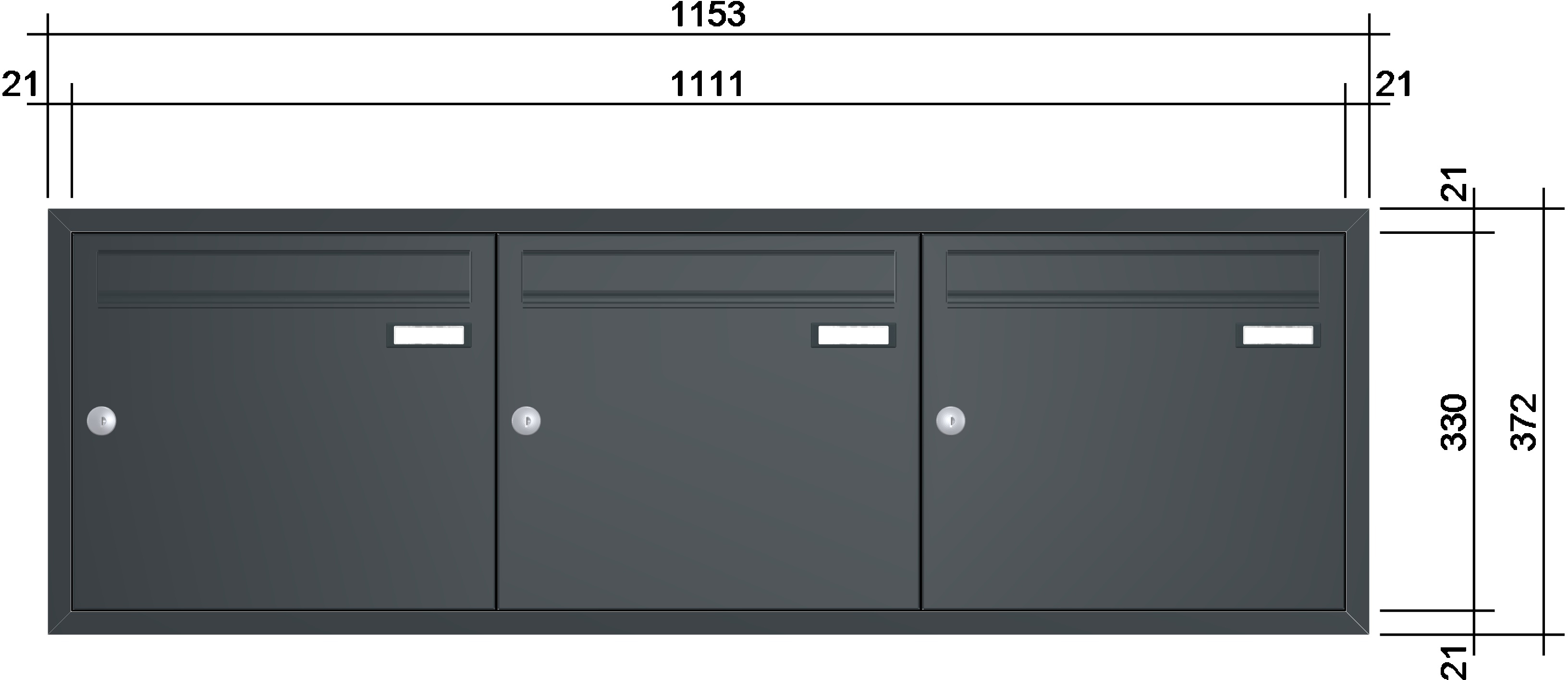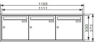 Jeder Briefkasten ist im Kastenmaß von 370 x 330 x 100 mm (B x H x T) ausgeführt. Inkl. umlaufendem Putzabdeckrahmen zum Einsatz der Anlage im ungeschützten Außenbereich. Einwurfklappe 325 x 35 mm (B x H).