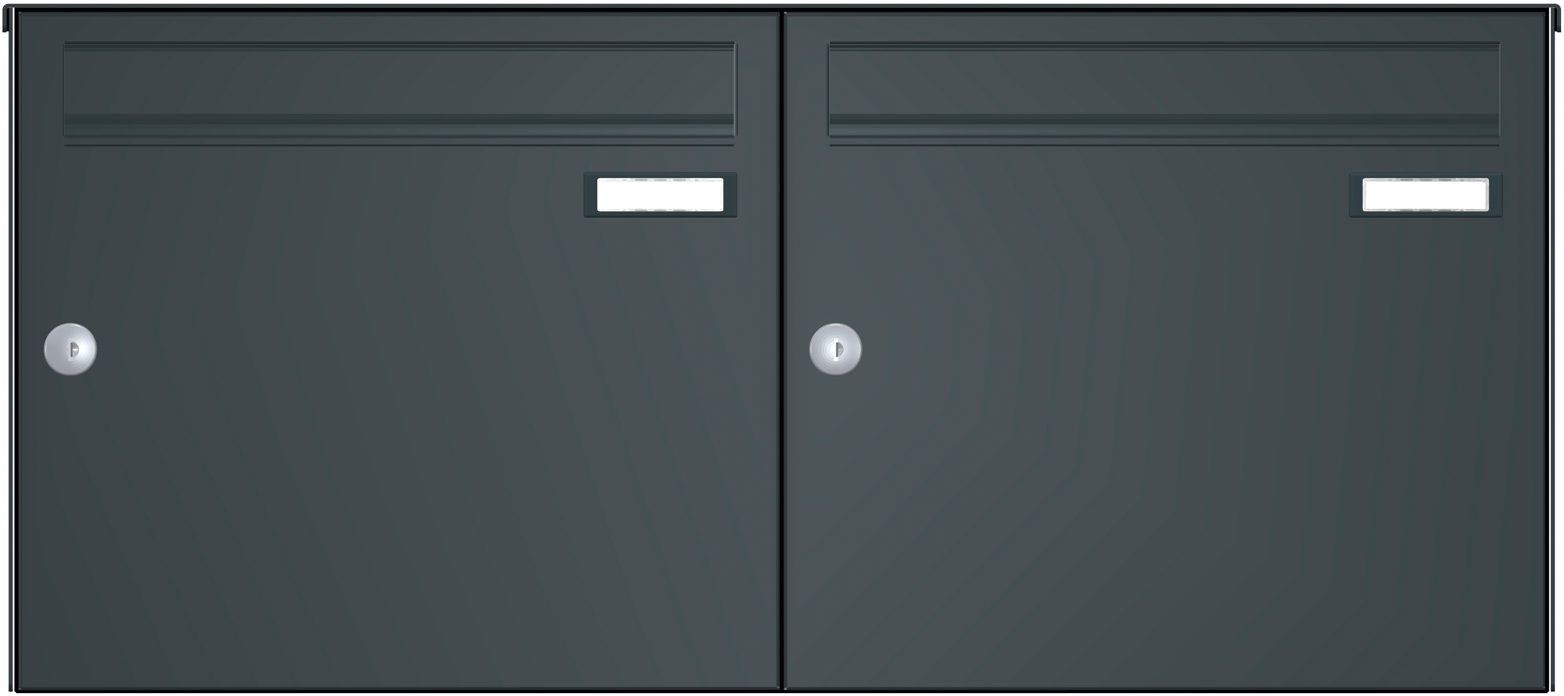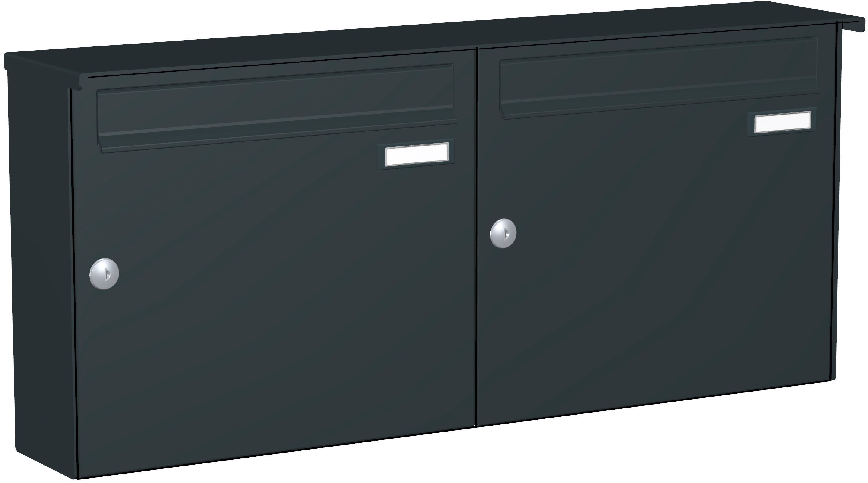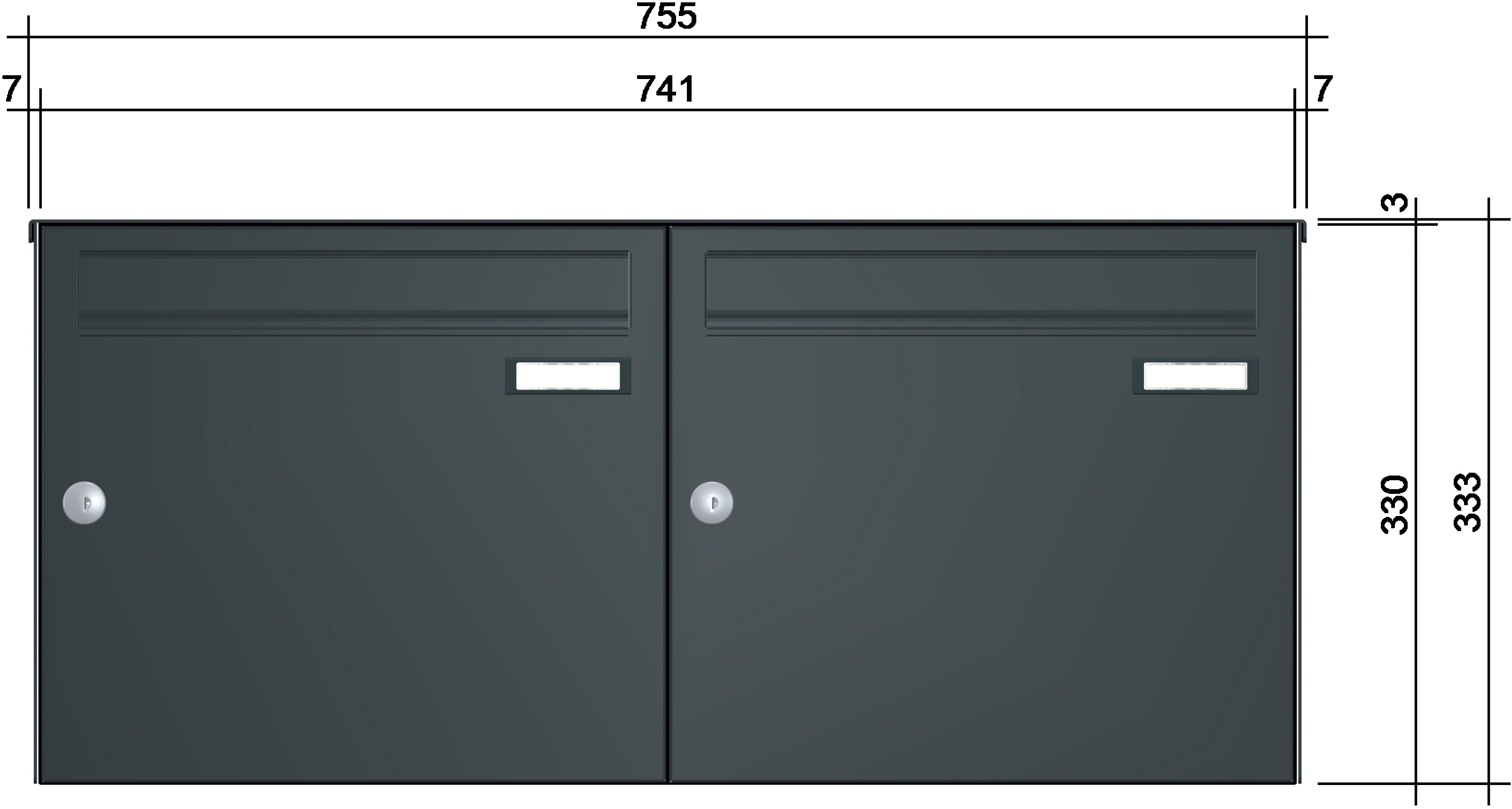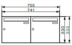 Jeder Briefkasten ist im Kastenmaß von 370x330x100mm (BxHxT)ausgeführt.Einwurfklappen je 325 x 35 mm (BxHxT). Mit eckiger Verkleidung der Briefkästen und Regenabweiser, zum Einsatz der Anlage im ungeschützten Außenbereich.