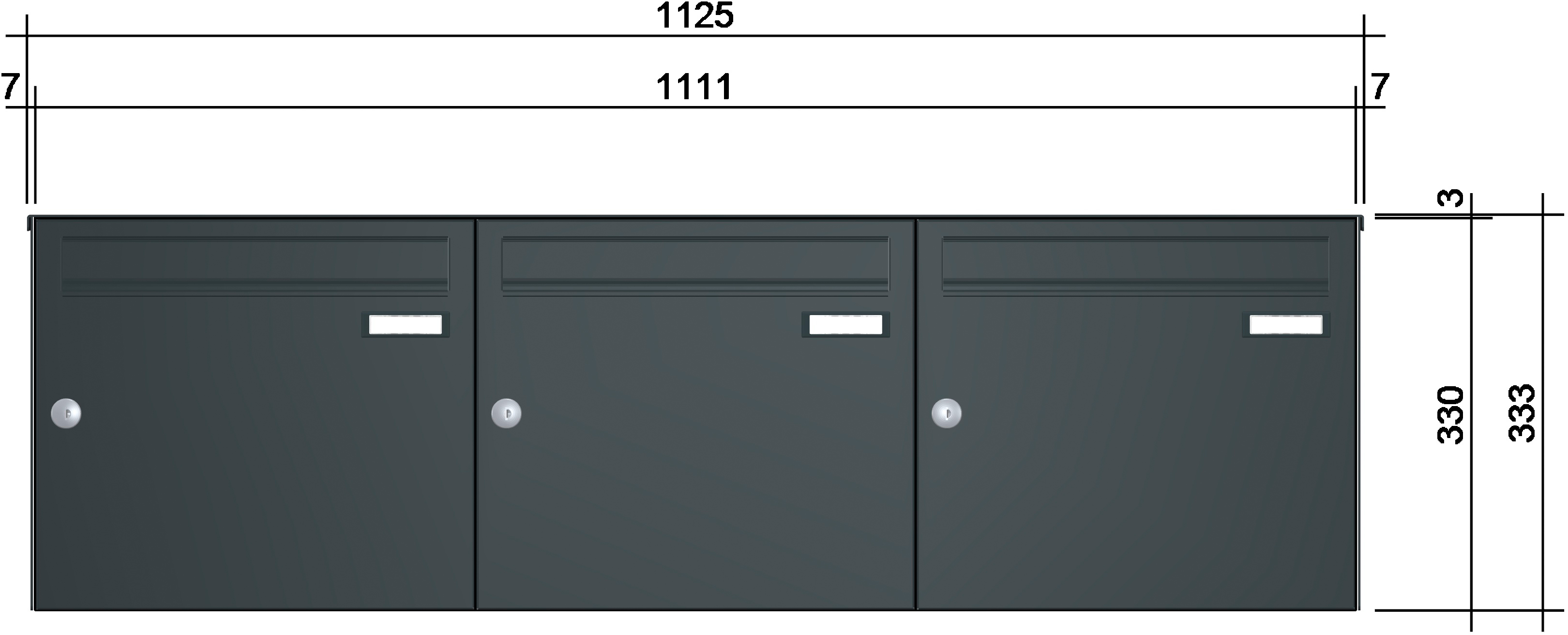 Jeder Briefkasten ist im Kastenmaß von 370x330x100mm (BxHxT)ausgeführt.Einwurfklappen je 325 x 35 mm (BxHxT). Mit eckiger Verkleidung der Briefkästen und Regenabweiser, zum Einsatz der Anlage im ungeschützten Außenbereich.