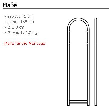 165 cm Länge (ca. 115 cm über dem Boden bei Variante zum Einbetonieren); Ø 3,8 cm Durchmesser des Rohres; Abstand der Rohre (Außenmaß): 41 cm; Gewicht: 5,5 kg.