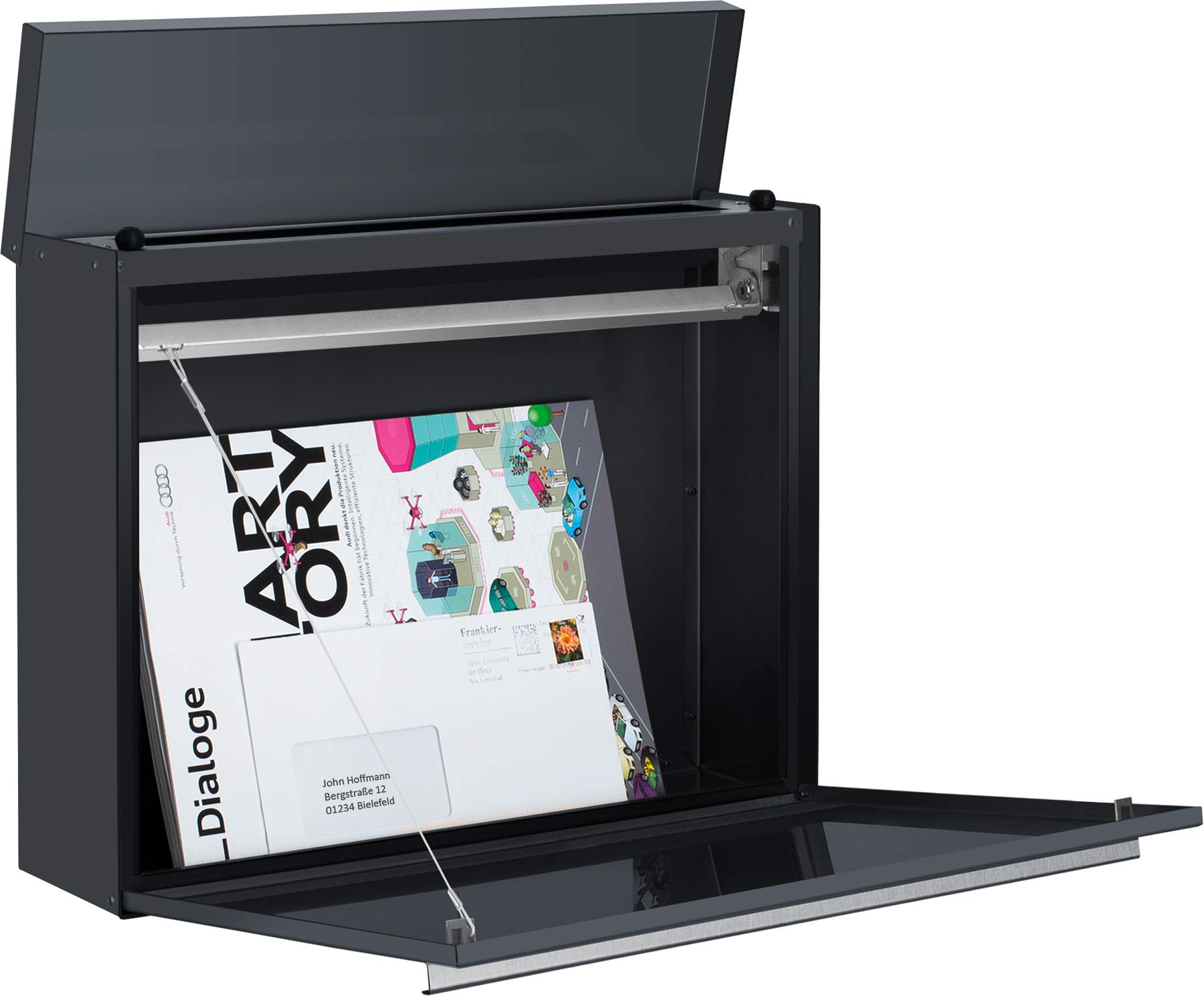 Der Einwurf der Post erfolgt von oben, die Tür kann an dem Griff aus gebürstetem Edelstahl von oben nach unten geöffnet werden. Das Schloss befindet sich seitlich rechts.