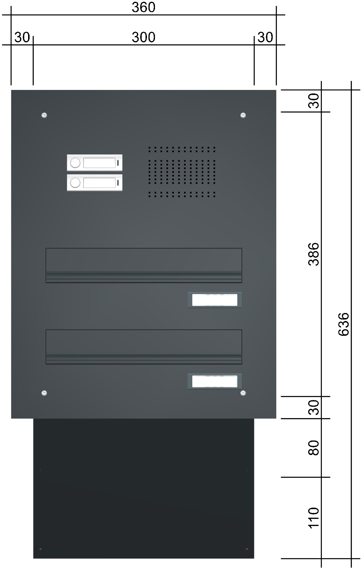 Jeder Briefkasten ist im Kastenmaß von 300 x 110 x 290 – 440 mm (B x H x T) ausgeführt. Die Briefkästen sind in der Tiefe variabel von 290 – 440 mm, um sich Ihrer Mauerstärke optimal anzupassen (30 Grad Winkel schräg nach hinten laufend). Einwurfklappe 265 x 35 mm (B x H).
