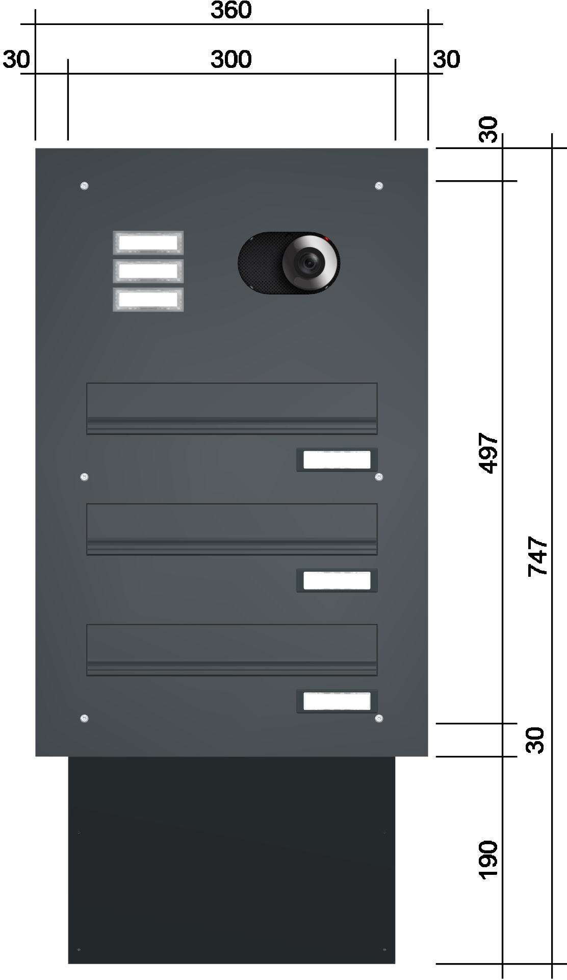 Jeder Briefkasten ist im Kastenmaß von 300 x 110 x 290 – 440 mm (B x H x T) ausgeführt. Die Briefkästen sind in der Tiefe variabel von 290 – 440 mm, um sich Ihrer Mauerstärke optimal anzupassen (30 Grad Winkel schräg nach hinten laufend). Einwurfklappe 265 x 35 mm (B x H).