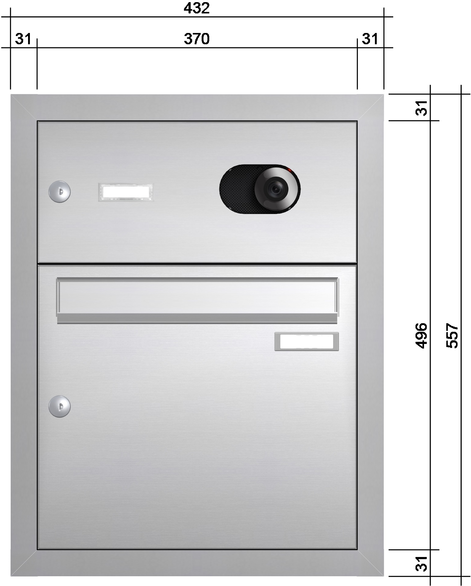 Jeder Briefkasten ist im Kastenmaß von 370 x 330 x 100 mm (B x H x T) ausgeführt. Inkl. umlaufendem Putzabdeckrahmen zum Einsatz der Anlage im ungeschützten Außenbereich. Einwurfklappe 325 x 35 mm (B x H). Die Kästen entsprechen der aktuellen EN-Norm 13724 damit z.B. A4-Umschläge ungeknickt eingeworfen werden können und Schutz gegen Aufbruch gewährleistet ist. Die Gesamtmaße können Sie den Skizzen entnehmen.