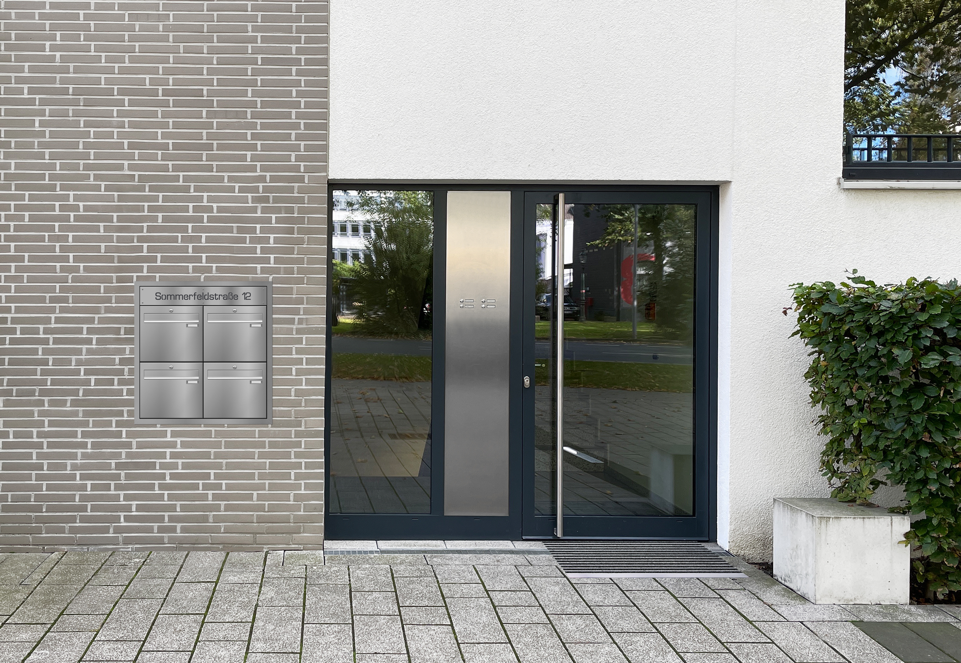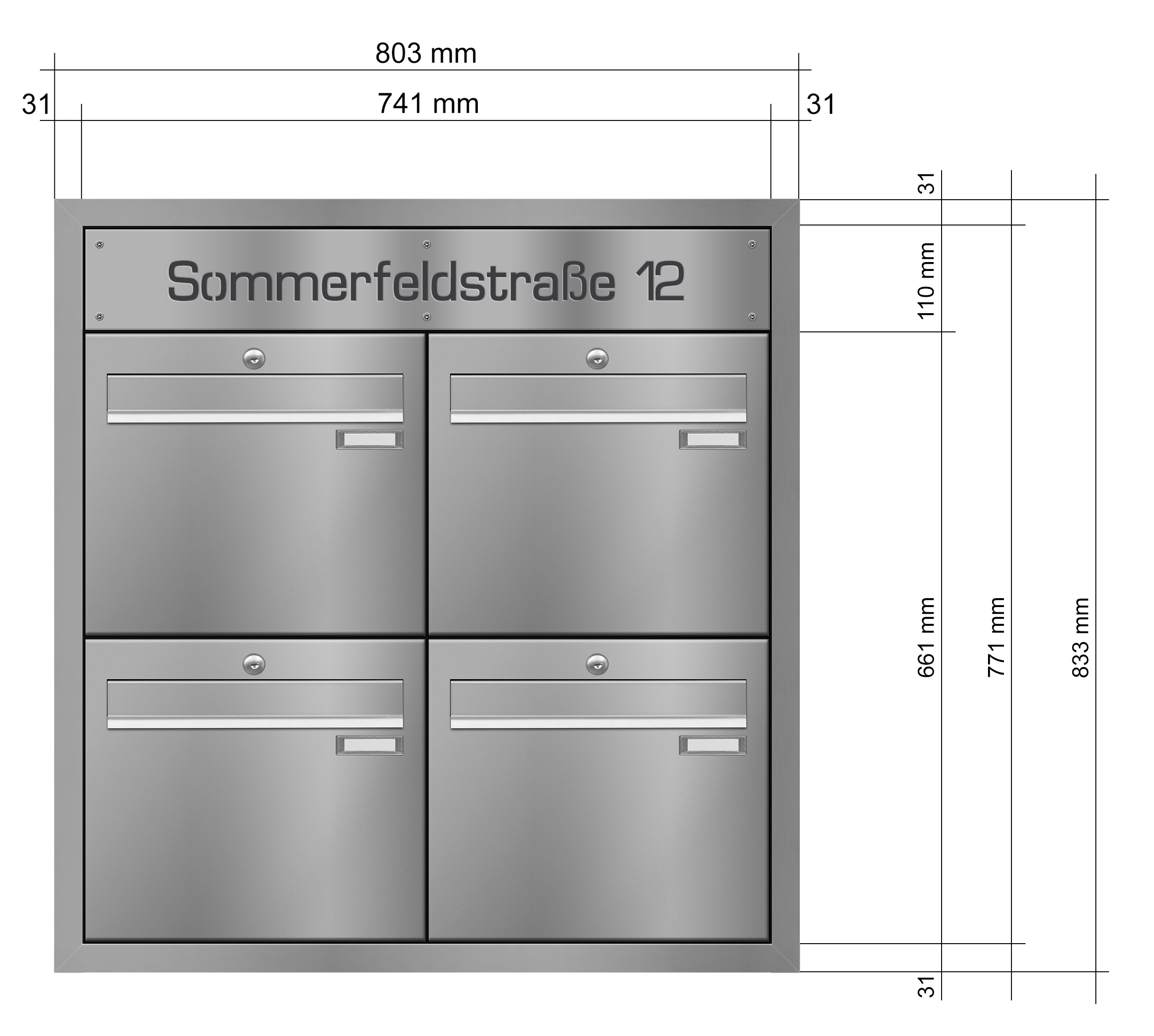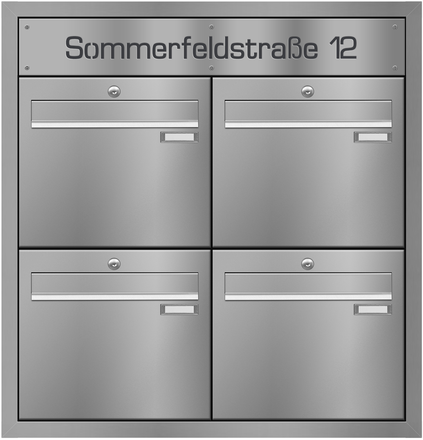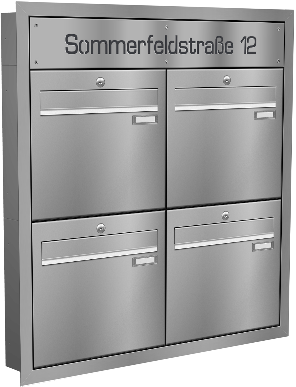 Die Unterputz Briefkastenanlage LUIS überzeugt durch ihr schlichtes Design und ein sehr gutes Preis-Leitungsverhältnis. Die Briefkästen werden aus gebürstetem Edelstahl gefertigt. Mit einem Fassungsvolumen von 12 Liter pro Briefkasten ist ausreichend Platz für Briefe und sogar Zeitungen und Zeitschriften. C4-Umschläge nimmt das Modell LUIS im Querformat, ohne zu knicken problemlos auf. Die Türen klappen zur Entnahme nach unten, ein Fangband hält dabei die Tür so, dass eine Entnahme sicher und bequem möglich ist. Die Namensbeschriftung kann durch die wechselbare Schrifteinlage jederzeit unkompliziert ausgewechselt werden. Die Anlage wird mit einen umlaufenden Unterputzrahmen in sich komplett montiert für den Einbau vor Ort angeliefert.