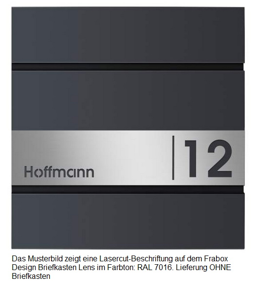 Möchten Sie Ihren Frabox Briefkasten individuell gestalten? Unsere ®frabox-Lasercut-Beschriftung bietet eine präzise, handgefertigte Lösung. Hochwertiger Edelstahl wird mit einem Präzisionslaser ausgeschnitten, von Hand gebürstet und veredelt. Die Montage ist kinderleicht, dank bereits angebrachtem Spezialklebeband. Geben Sie Ihrem Briefkasten einen einzigartigen Touch mit dieser langlebigen und eleganten Beschriftung.