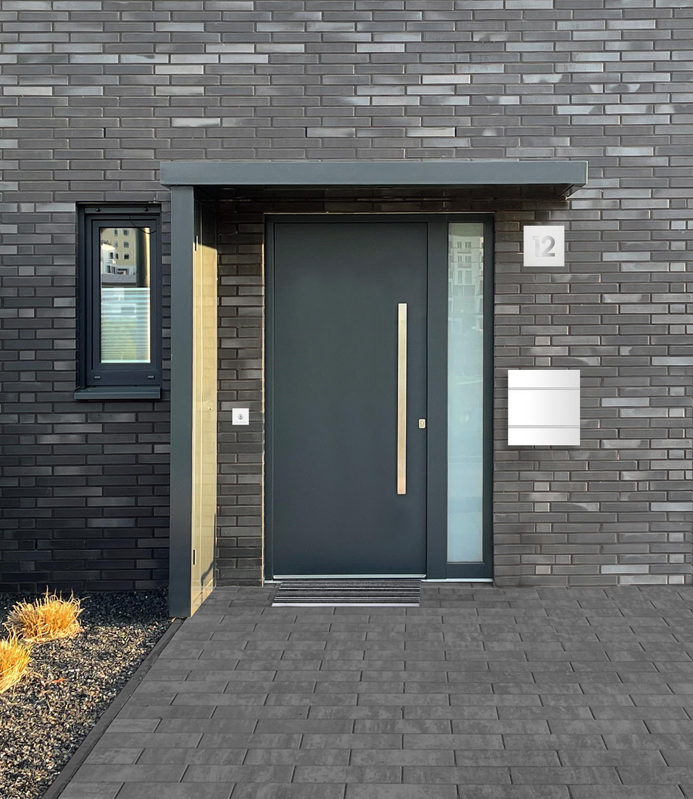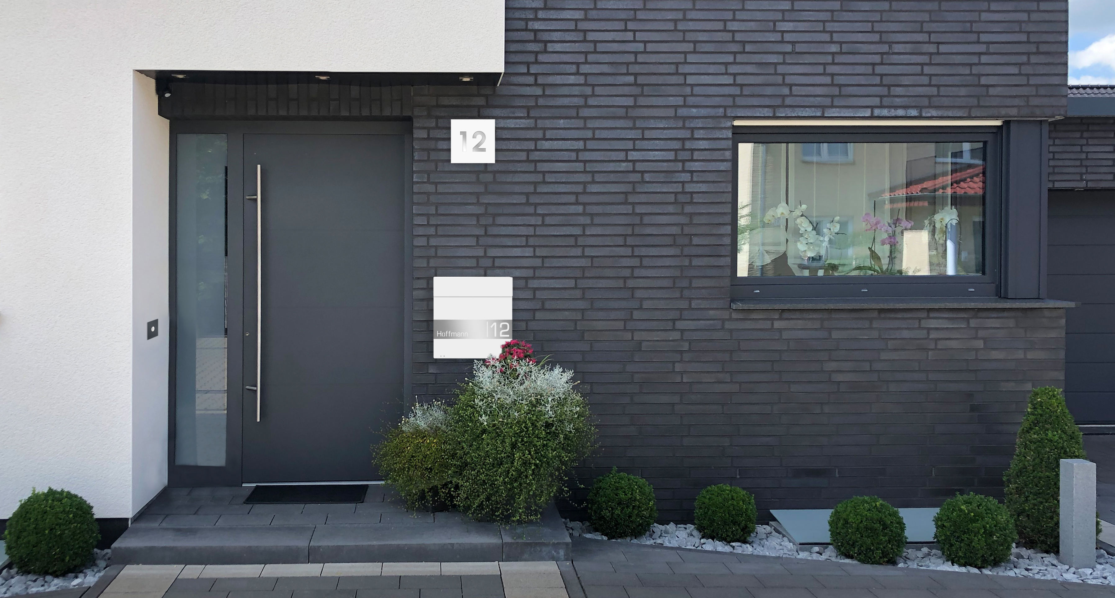 Das Hausnummernschild LENS harmoniert besonders gut mit den Frabox-Briefkästen.