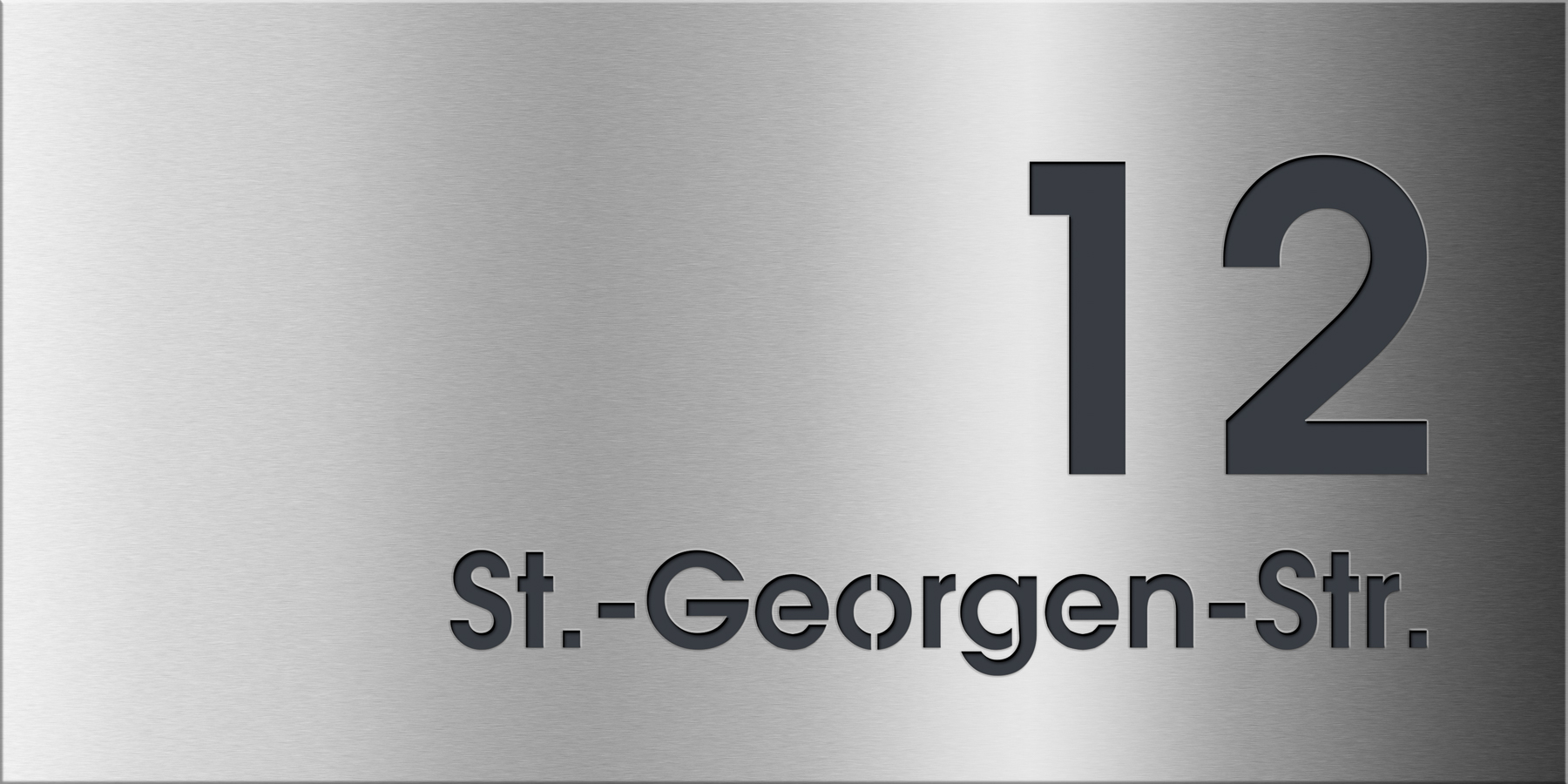 Dieses Hausnummernschild präsentiert Ihre Hausnummer und den Straßennamen elegant und modern zugleich. Dazu wird Ihre Hausnummer und der Straßenname aus dem Edelstahl ausgelasert und anschließend rückseitig eine anthrazitfarben (RAL 7016) lackierte Metallplatte angebracht. So entsteht ein idealer Kontrast, damit Ihre Hausnummer gut zu erkennen ist.