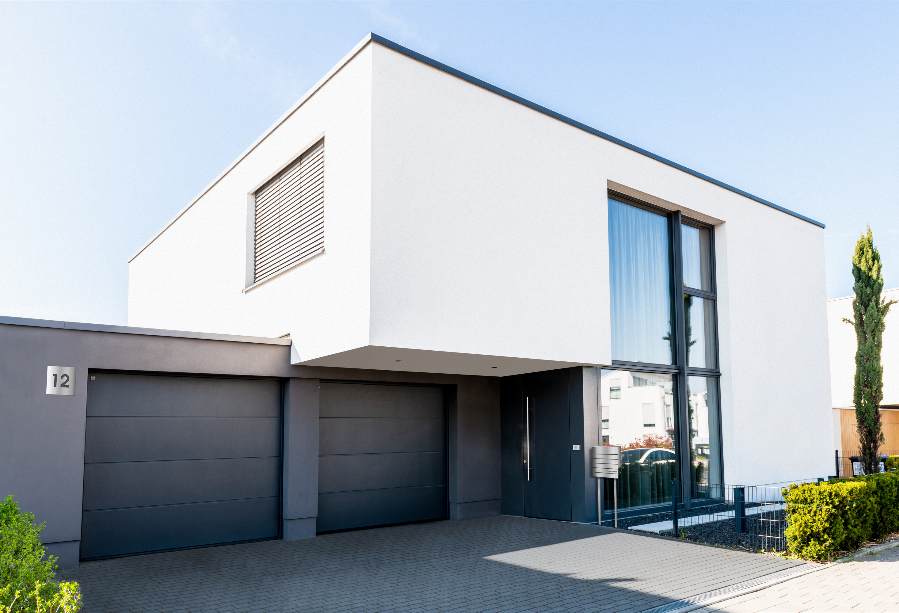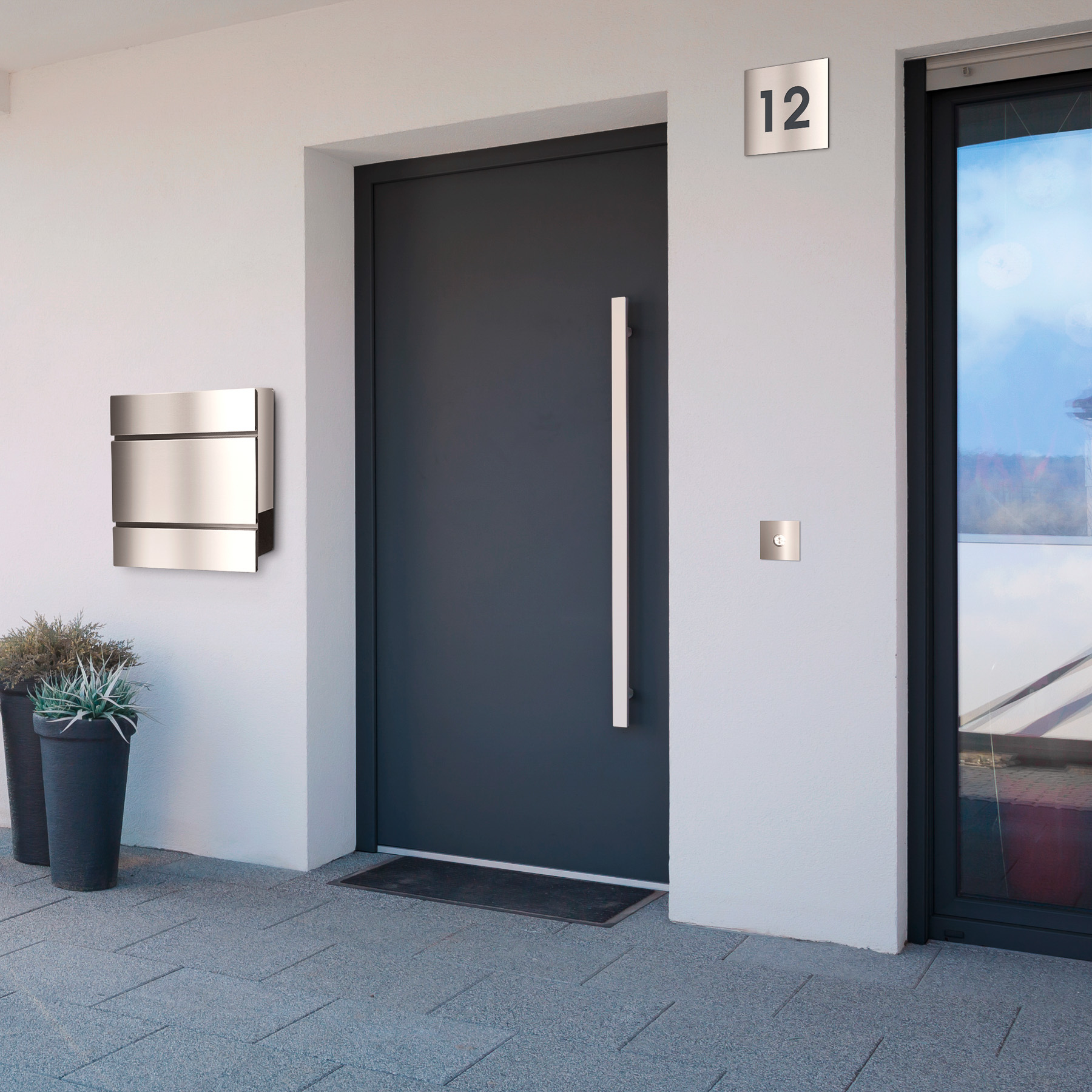 Das Hausnummernschild harmoniert besonders gut mit den Frabox-Briefkästen.