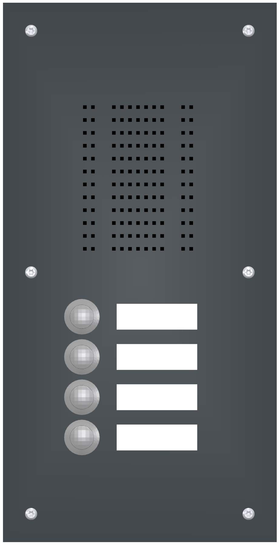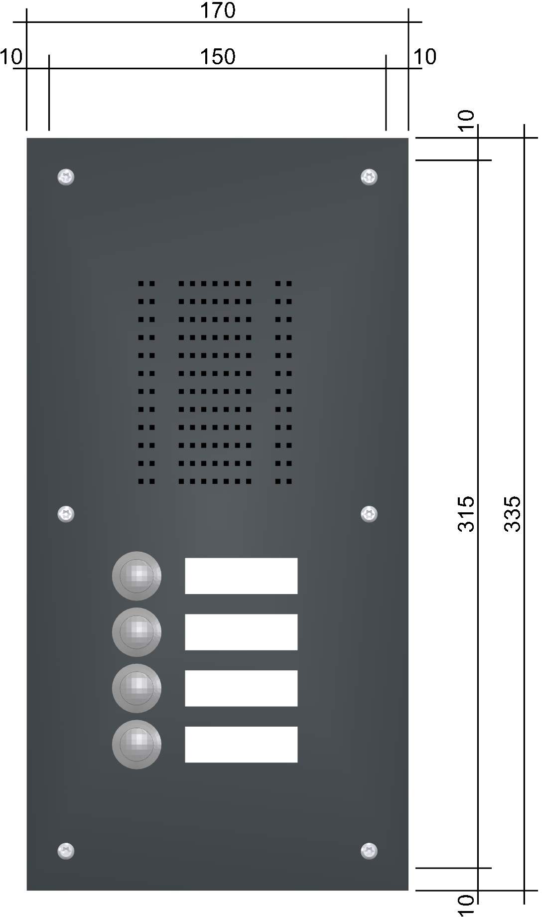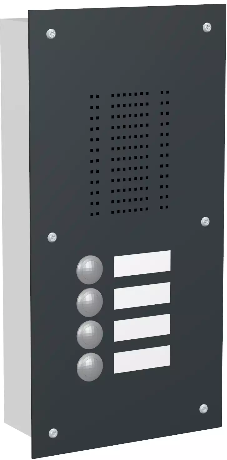 Diese Klingelplatte mit Sprechsieb ist im Farbton RAL 7016 anthrazigtau pulverlackiert.