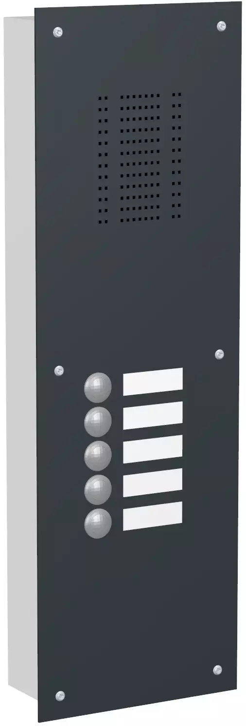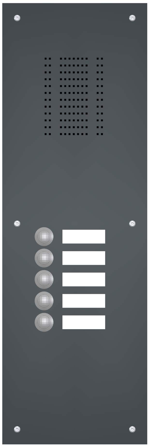 Diese Klingelplatte mit Sprechsieb ist im Farbton RAL 7016 anthrazigtau pulverlackiert.
