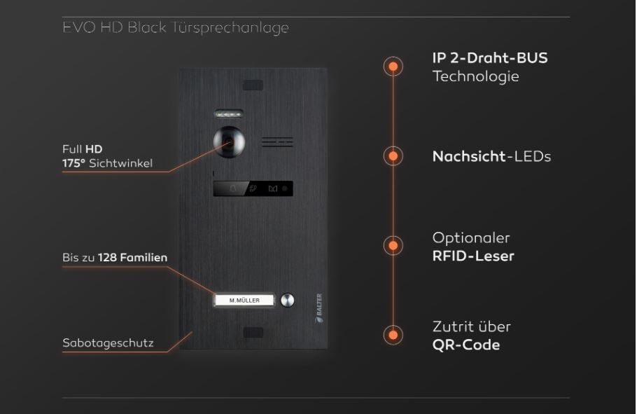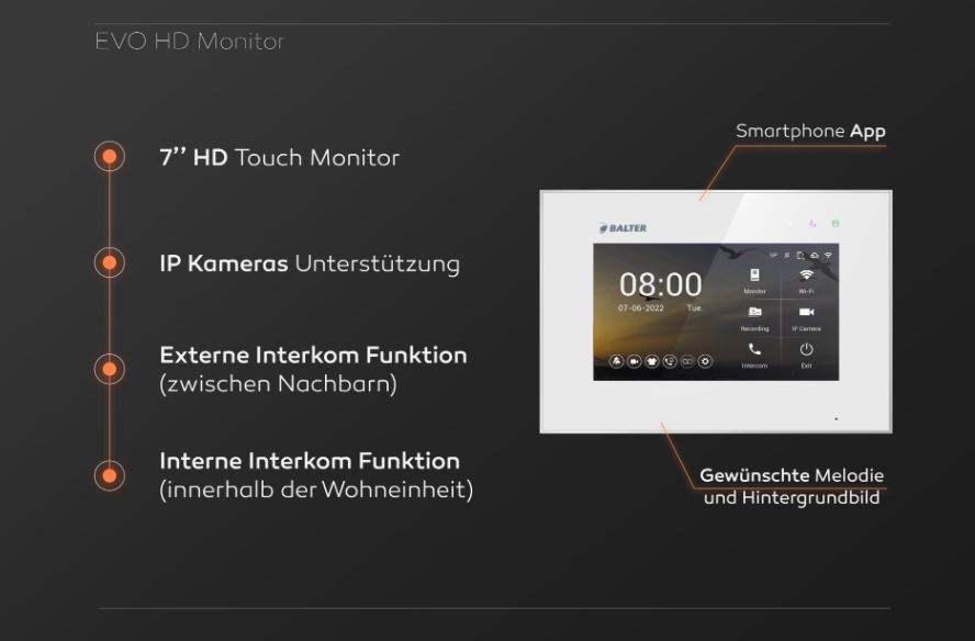 Das BALTER EVO HD KIT WIFI für Einfamilienhäsuer im elegantem Schwarz bietet eine umfassende Lösung für die Türkommunikation und Videoüberwachung in Einfamilienhäusern. Das Komplettsystem umfasst eine Full HD Türstation mit einer hochauflösenden 1080p Kamera, einen benutzerfreundlichen 7-Zoll WIFI HD-Monitor mit kapazitivem Touchscreen sowie einen Hauptstromverteiler für eine einfache Installation. Dieses System wurde entwickelt, um den Alltag komfortabler und sicherer zu gestalten – sei es durch die Steuerung per App, den Türöffner oder die klare Bild- und Videoüberwachung.