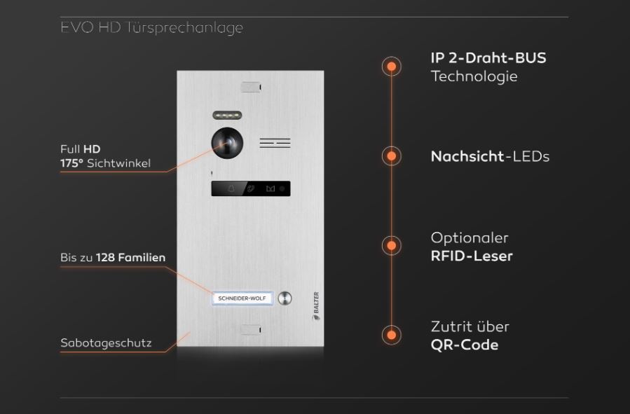 Das BALTER EVO HD KIT WIFI für Einfamilienhäsuer im elegantem Schwarz bietet eine umfassende Lösung für die Türkommunikation und Videoüberwachung in Einfamilienhäusern. Das Komplettsystem umfasst eine Full HD Türstation mit einer hochauflösenden 1080p Kamera, einen benutzerfreundlichen 7-Zoll WIFI HD-Monitor mit kapazitivem Touchscreen sowie einen Hauptstromverteiler für eine einfache Installation. Dieses System wurde entwickelt, um den Alltag komfortabler und sicherer zu gestalten – sei es durch die Steuerung per App, den Türöffner oder die klare Bild- und Videoüberwachung.