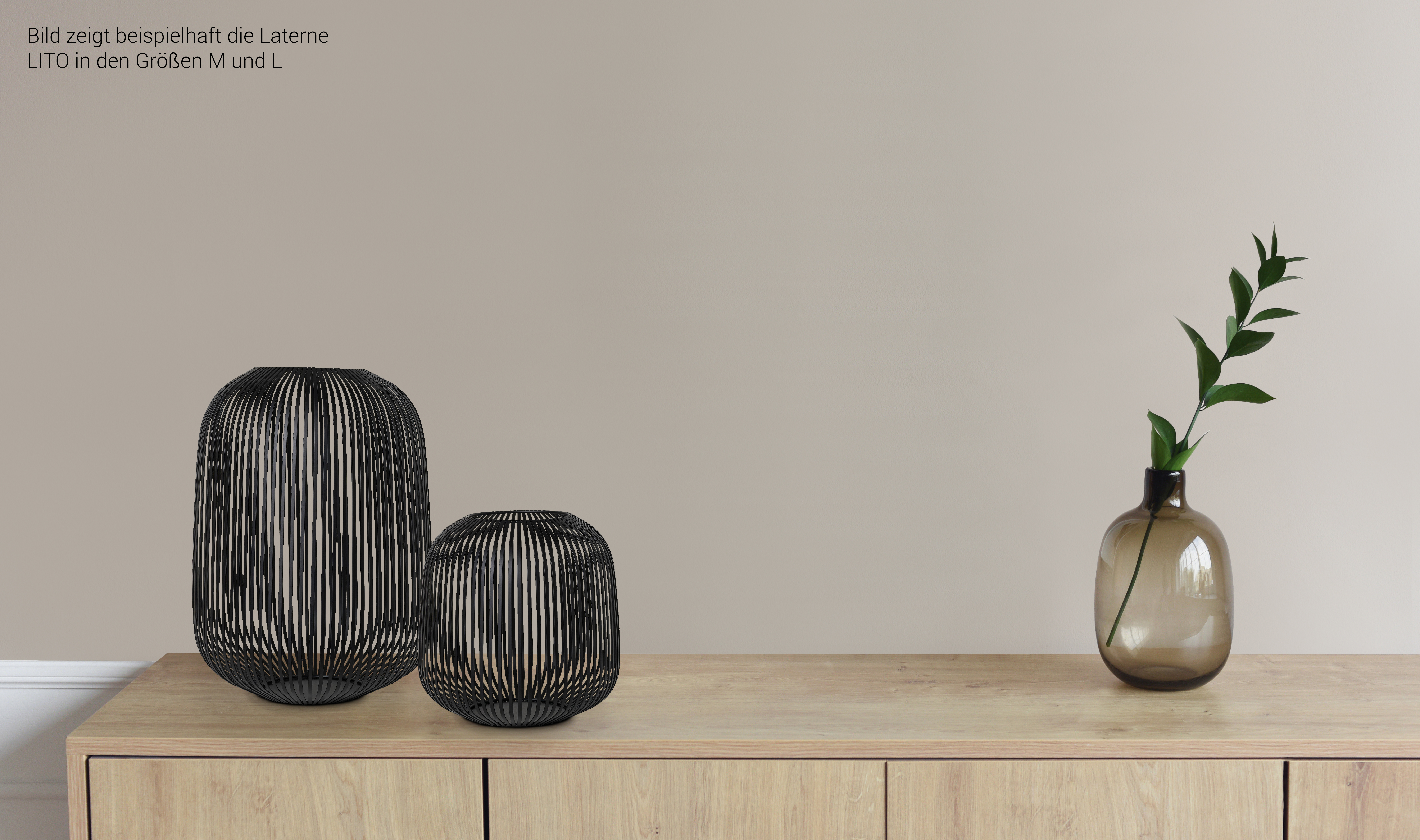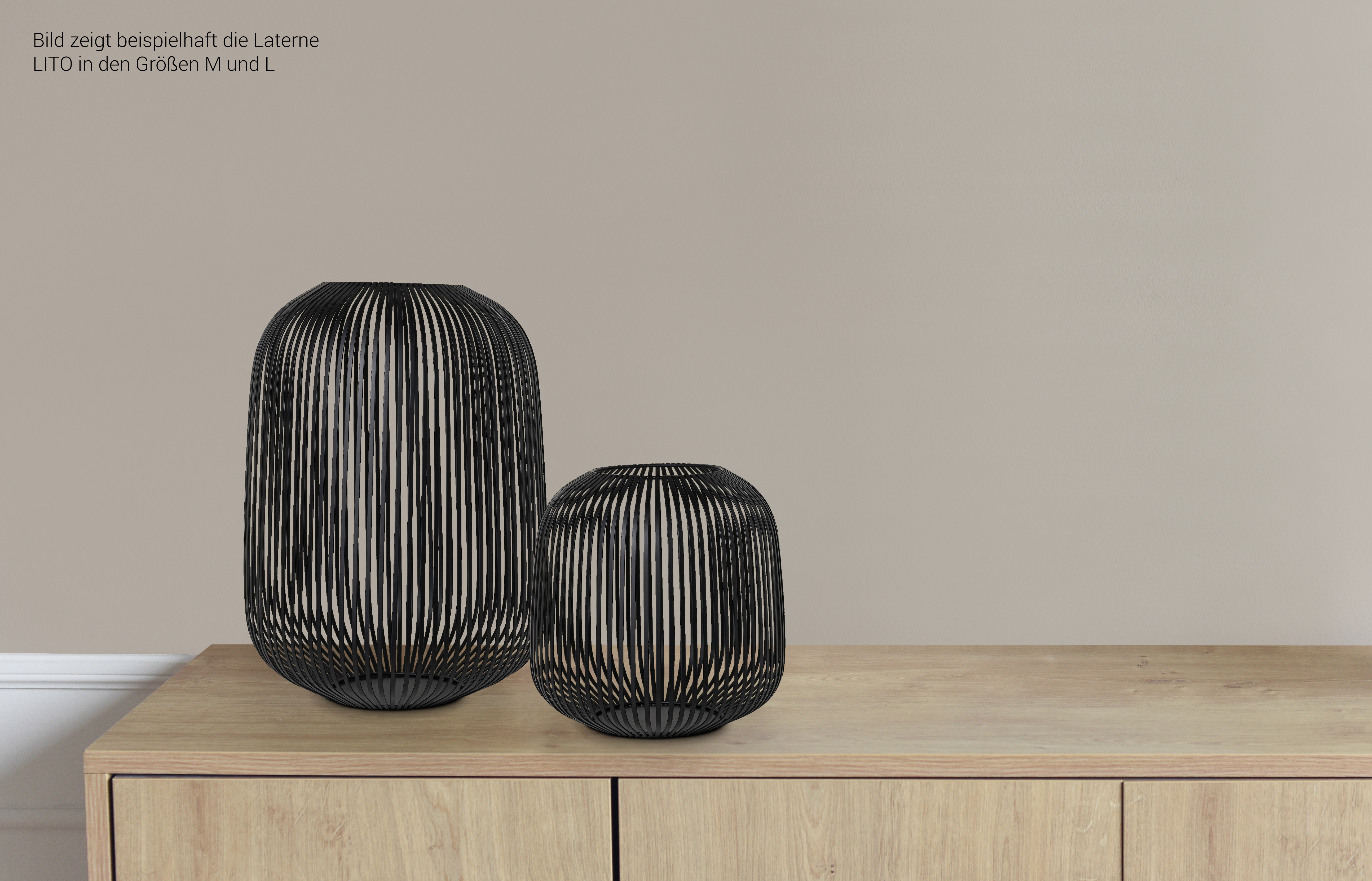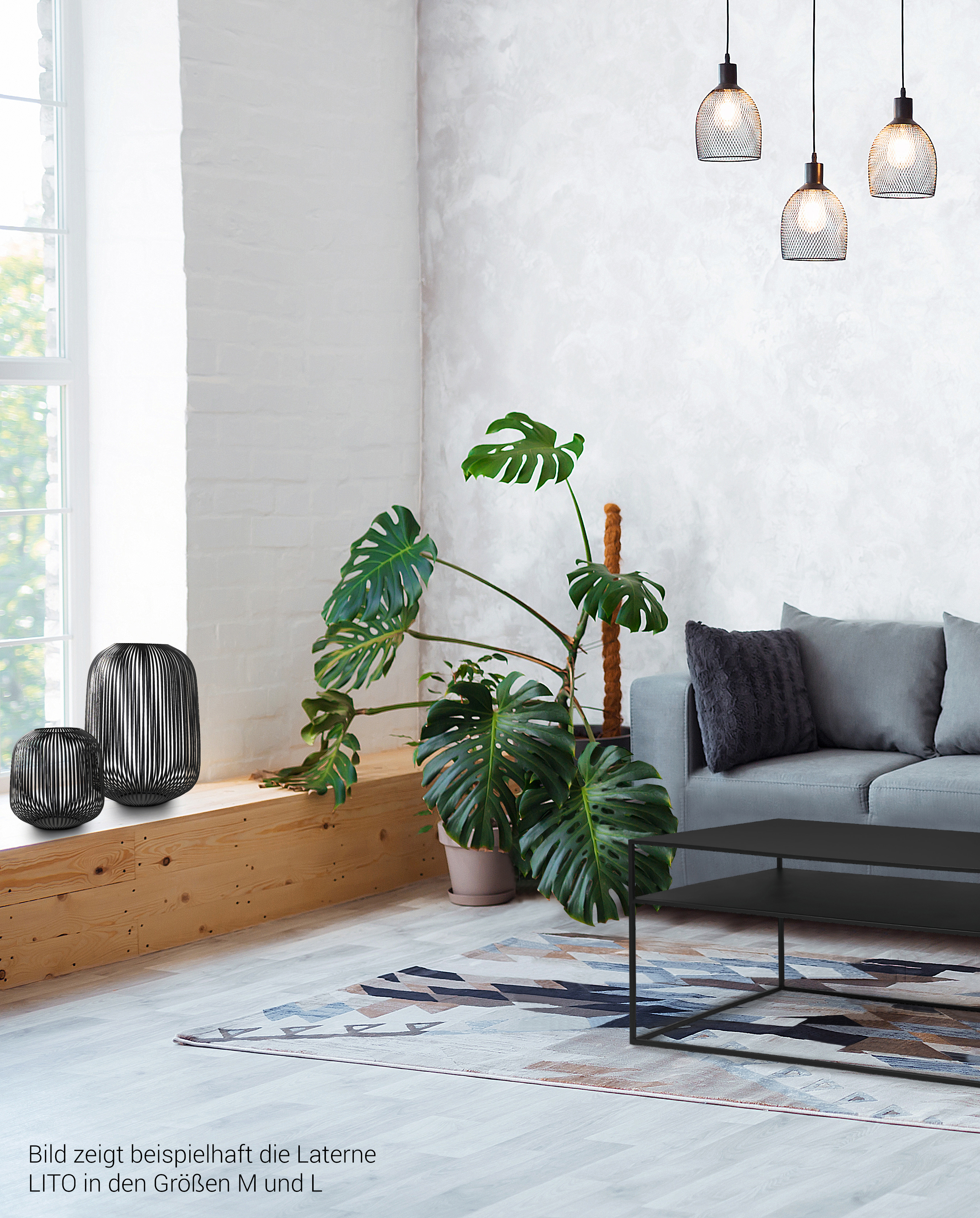 Schöner Schein: Die Laterne LITO versprüht nicht nur wunderschöne Lichteffekte, sondern auch eine stimmungsvolle Atmosphäre. Die schmalen pulverbeschichteten Stahlstreben vermitteln eine stilvolle Leichtigkeit, gepaart mit einem rustikalen Touch. In mehreren Größen erhältlich, die sich wunderbar miteinander kombinieren lassen. Nur für die Benutzung im Innenraum geeignet.