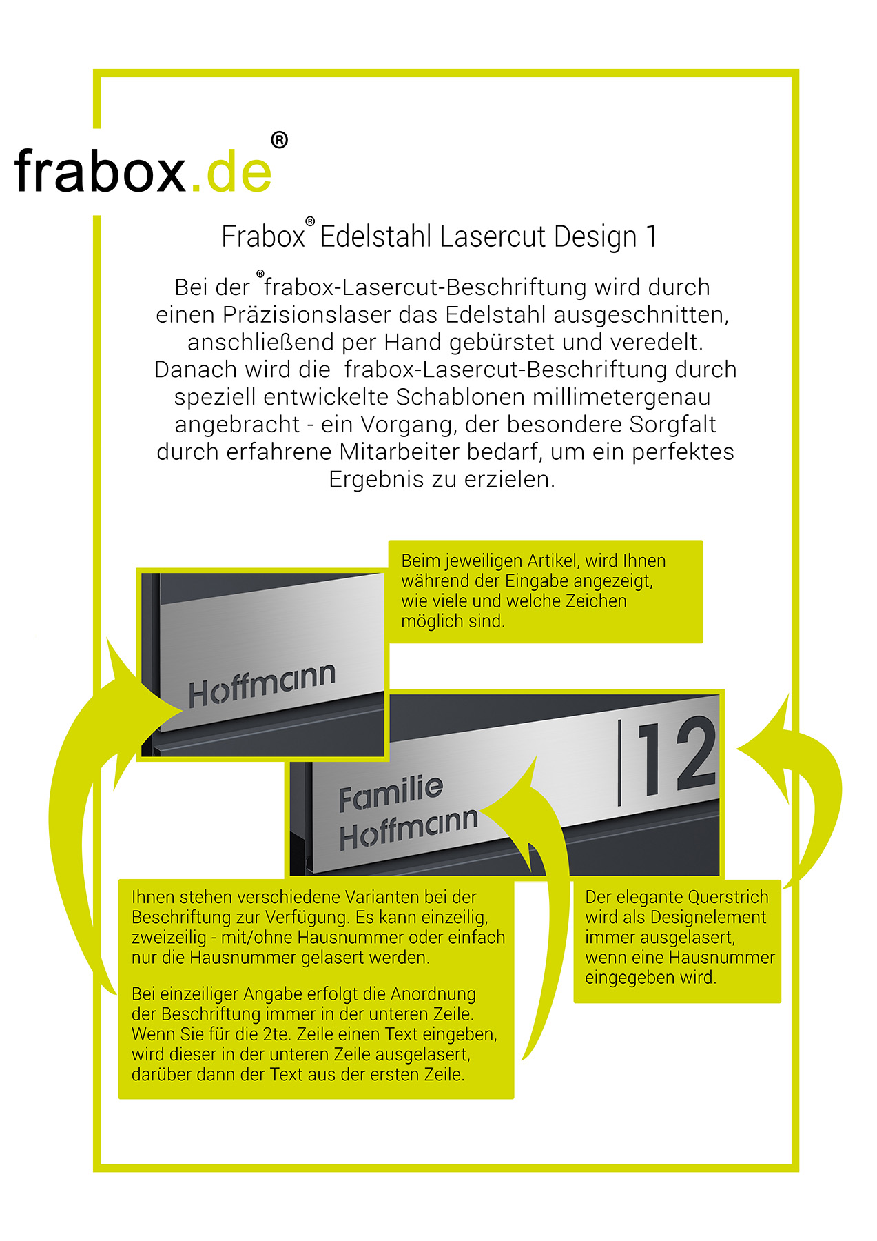 Bei der ®frabox-Lasercut-Beschriftung wird durch einen Präzisionslaser das Edelstahl ausgeschnitten und anschließend per Hand gebürstet und veredelt. Danach wird die ®frabox-Lasercut-Beschriftung durch speziell entwickelte Schablonen millimetergenau angebracht - ein Vorgang, der besonderer Sorgfalt durch erfahrene Mitarbeiter bedarf, um ein perfektes Ergebnis zu erzielen.