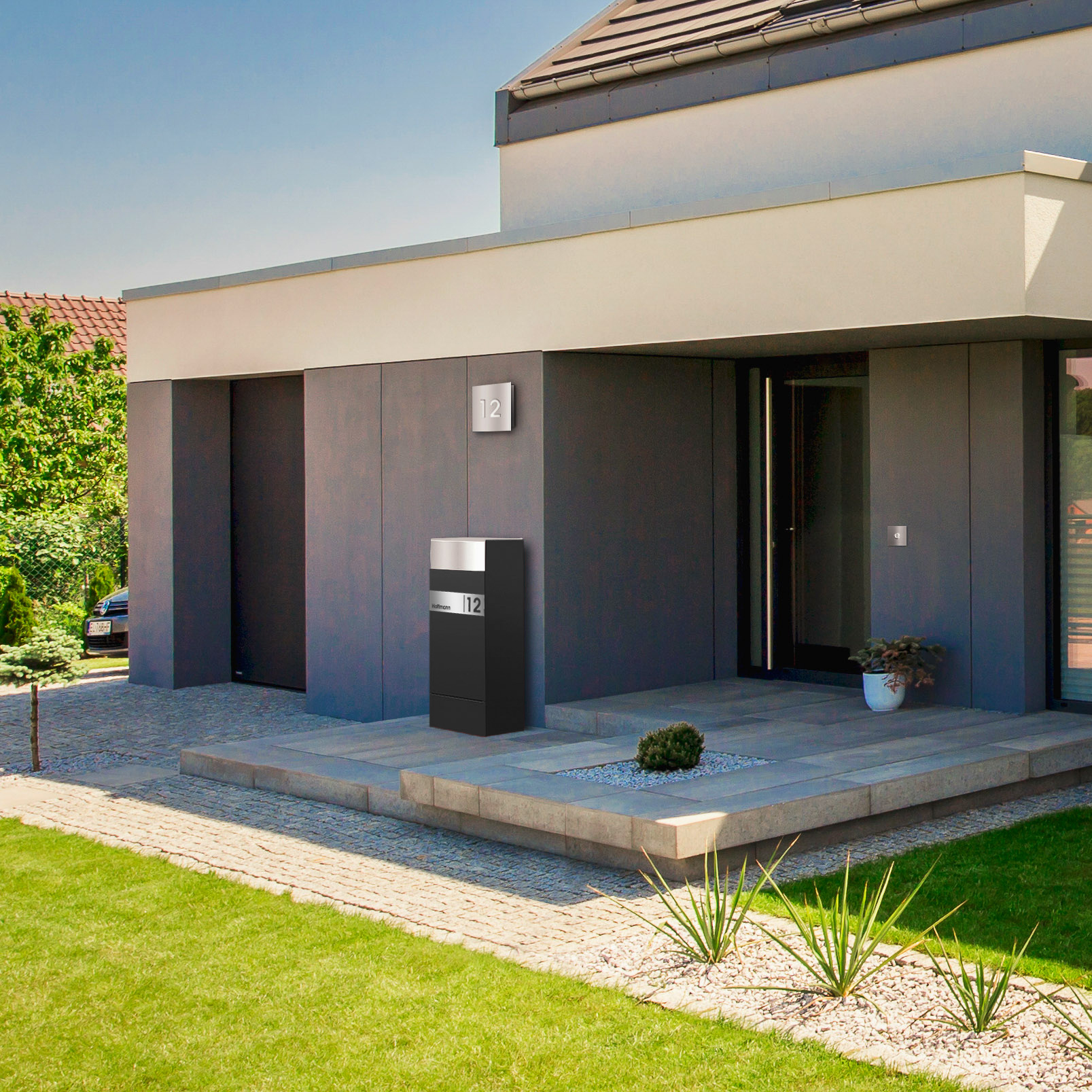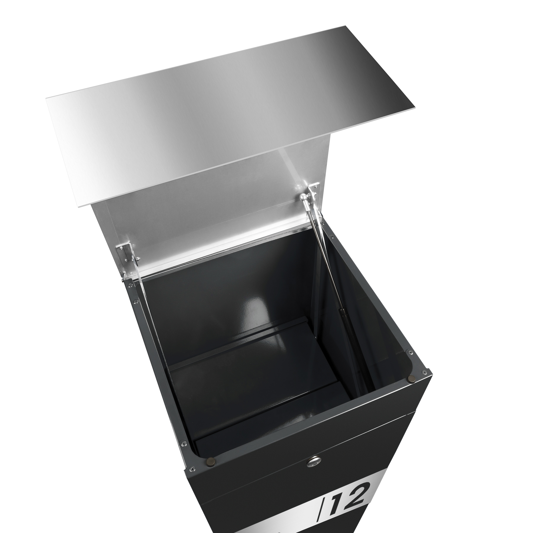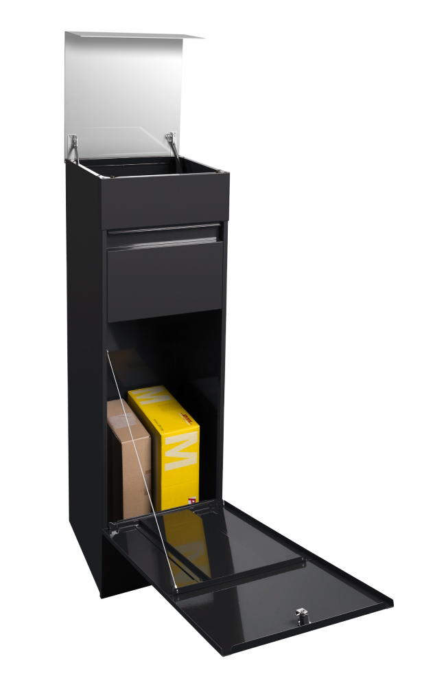Der Design Paketkasten NAMUR wird aus verzinktem, lackiertem Stahl sowie einer Einwurfklappe aus hochwertigem Edelstahl gefertigt und ist ein wahres Design Kunstwerk: Er harmoniert durch seine klaren Linien und seine geradlinige Optik perfekt mit seiner Umgebung. Das moderne Design kombiniert mit hochwertigen Materialien und präziser Verarbeitung garantiert Ihnen lange Freude an diesem schönen Paketkasten. Das Schloss befindet sich witterungsgeschützt unterhalb der Einwurfklappe. Die massive Einwurfklappe schließt durch die eingebaute Gasdruckfeder sanft. Der Einwurf erfolgt von oben, die Paketentnahme erfolgt auf der Frontseite. Mit insgesamt 66 Litern Fassungsvermögen bietet NAMUR viel Platz für Ihre Pakete.