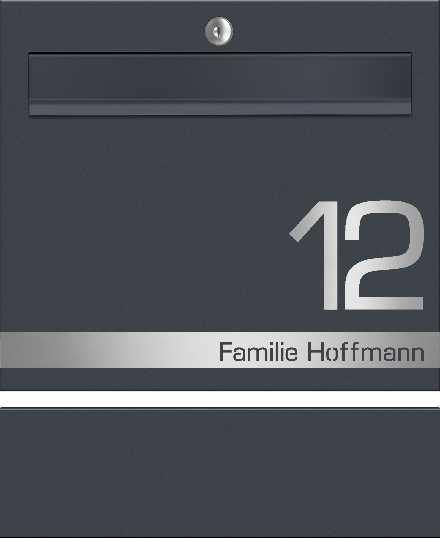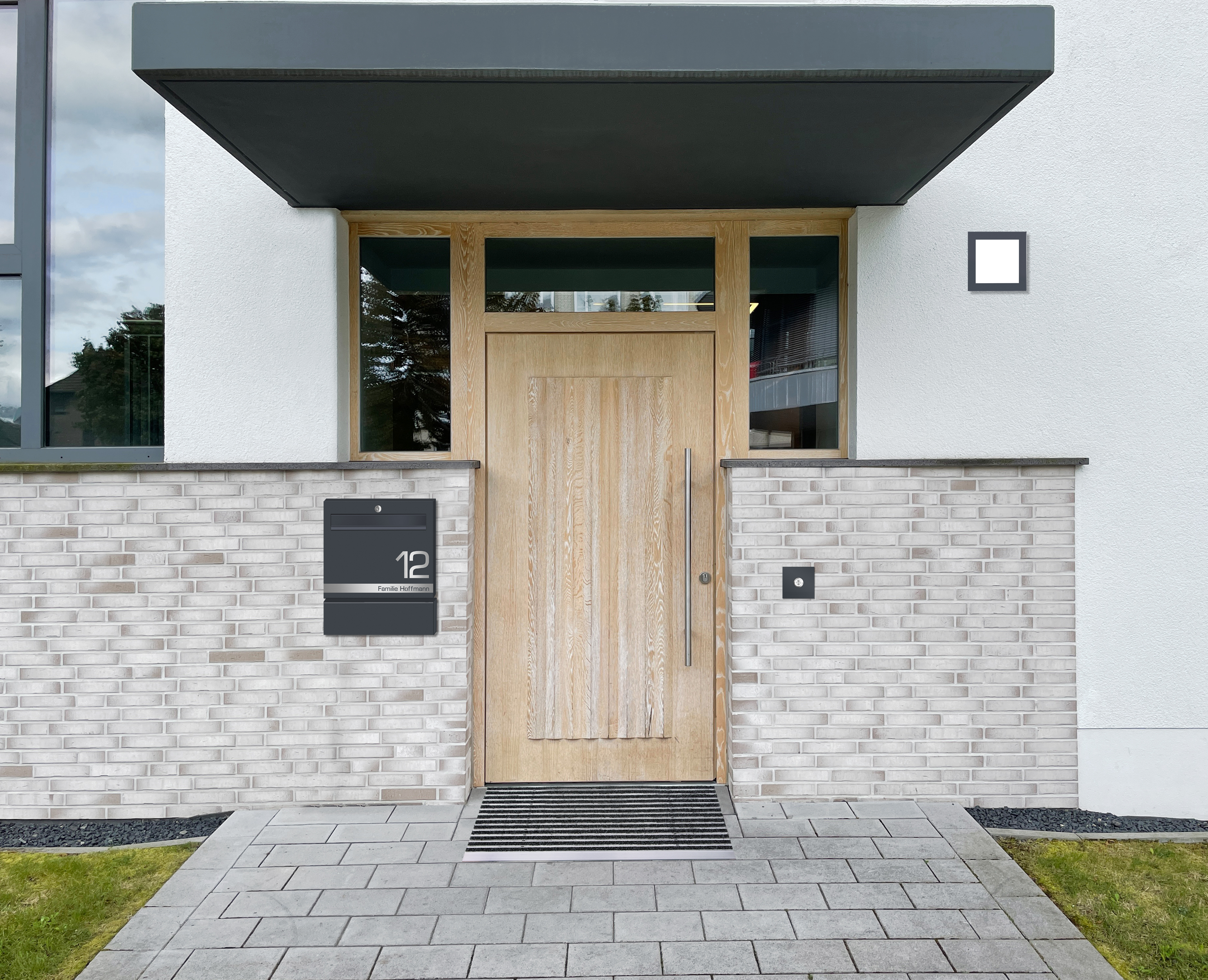 Der Frabox Briefkasten ENYA überzeugt durch elegantes, schlichtes Design, hochwertige Verarbeitung und das hervorragendes Preis-Leistungs-Verhältnis. Der ENYA ist aus verzinktem Stahl gefertigt, in RAL 7016 anthrazitgrau pulverlackiert und sehr stabil. Durch das schlichte Desing wirkt der Briefkasten an der Hausfassade sehr edel. Die Türe öffnet von oben nach unten und verfügt über einen Stopp bei ca. 90 Grad, damit die Post beim Öffnen des Briefkastens nicht herunterfallen kann.