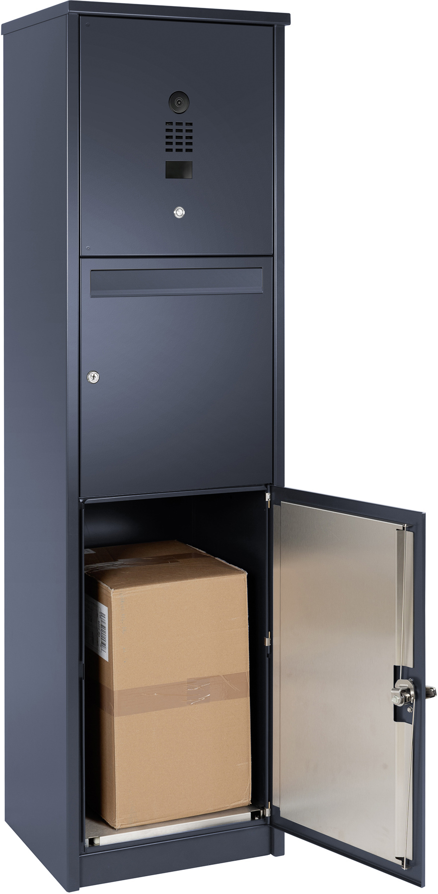 Das Paketfach ist zustellerunabhängig und mit einem speziellen Schloß, dem CLEVERLOCK, ausgestattet. CLEVERLOCK ist ein mechanisches Paketschloss: die Tür des Paketkastens ist geschlossen, aber das Paketfach für den Zusteller dennoch zugänglich und belieferbar. Nachdem das Paket hineingelegt wurde, verriegelt der Zusteller die Tür mit einem einfachen Klick. Das Paketfach kann nun erst wieder durch den Eigentümer mit Hilfe seines Schlüssels geöffnet werden. Smart & sicher zugleich! Und im separaten Briefkasten findet Ihre Post ausreichend Platz!