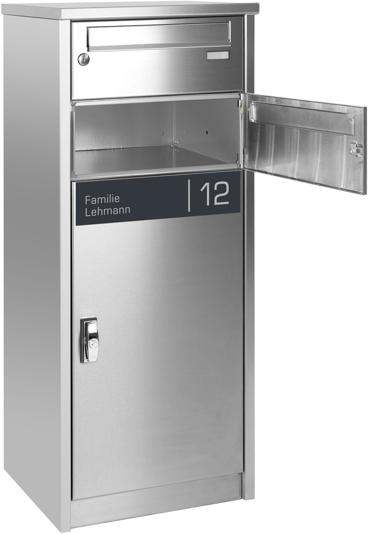 Bei der Frabox® Lasergravur wird Ihr Name und Ihre Hausnummer aus der lackierten Namensschildplatte ausgelasert, wodurch der Edelstahluntergrund zum Vorschein kommt. Die gravierte Namensschildplattet wird separat mitgeliefert und kann so flexibel an der gewünschten Position angebracht werden.