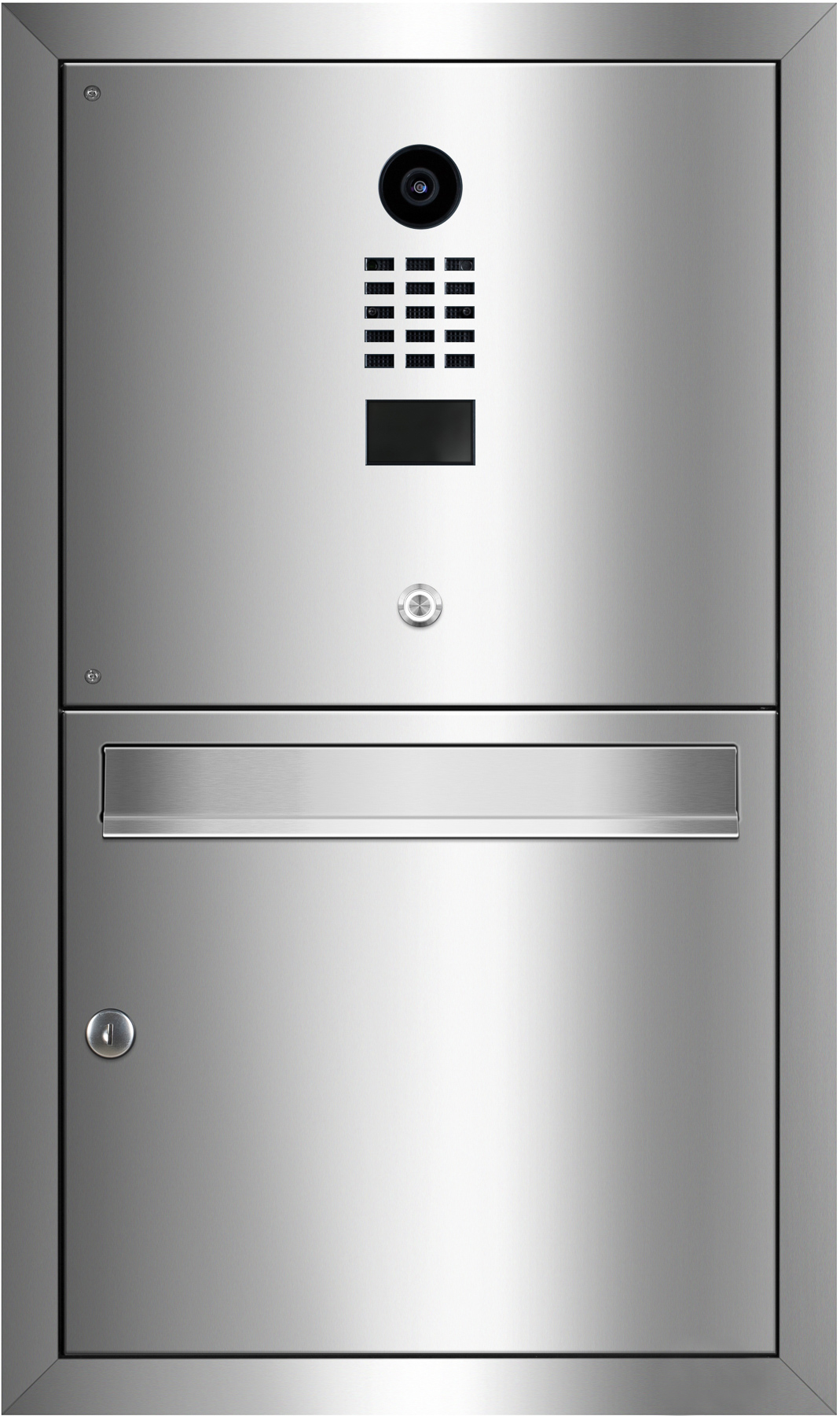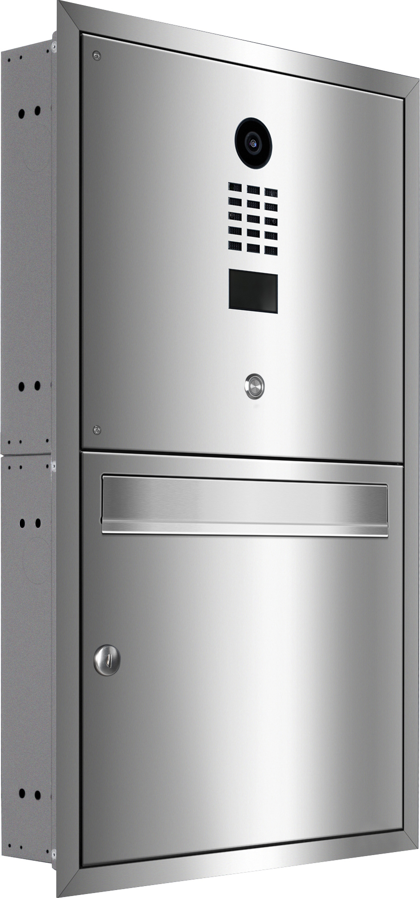 Der hochwertig verarbeitete Briefkasten OLEVA mit integrierter DoorBird Videotechnik ist für die Montage unterputz vorgesehen. Ein umlaufender Putzabdeckrahmen sorgt für einen sauberen Abschluss zur Wand.