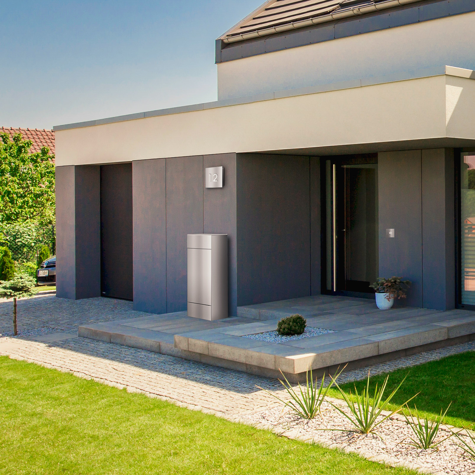 Der Design Paketkasten NAMUR wird aus hochwertigem Edelstahl gefertigt und ist ein wahres Design Kunstwerk: Er harmoniert durch seine klaren Linien und seine geradlinige Optik perfekt mit seiner Umgebung. Das moderne Design kombiniert mit hochwertigen Materialien und präziser Verarbeitung garantiert Ihnen lange Freude an diesem schönen Paketkasten. Das Schloss befindet sich witterungsgeschützt unterhalb der Einwurfklappe. Die massive Einwurfklappe schießt durch die eingebaute Gasdruckfeder sanft. Der Einwurf erfolgt von oben, die Paketentnahme erfolgt auf der Frontseite. Mit insgesamt 66 Litern Fassungsvermögen bietet NAMUR viel Platz für Ihre Pakete.