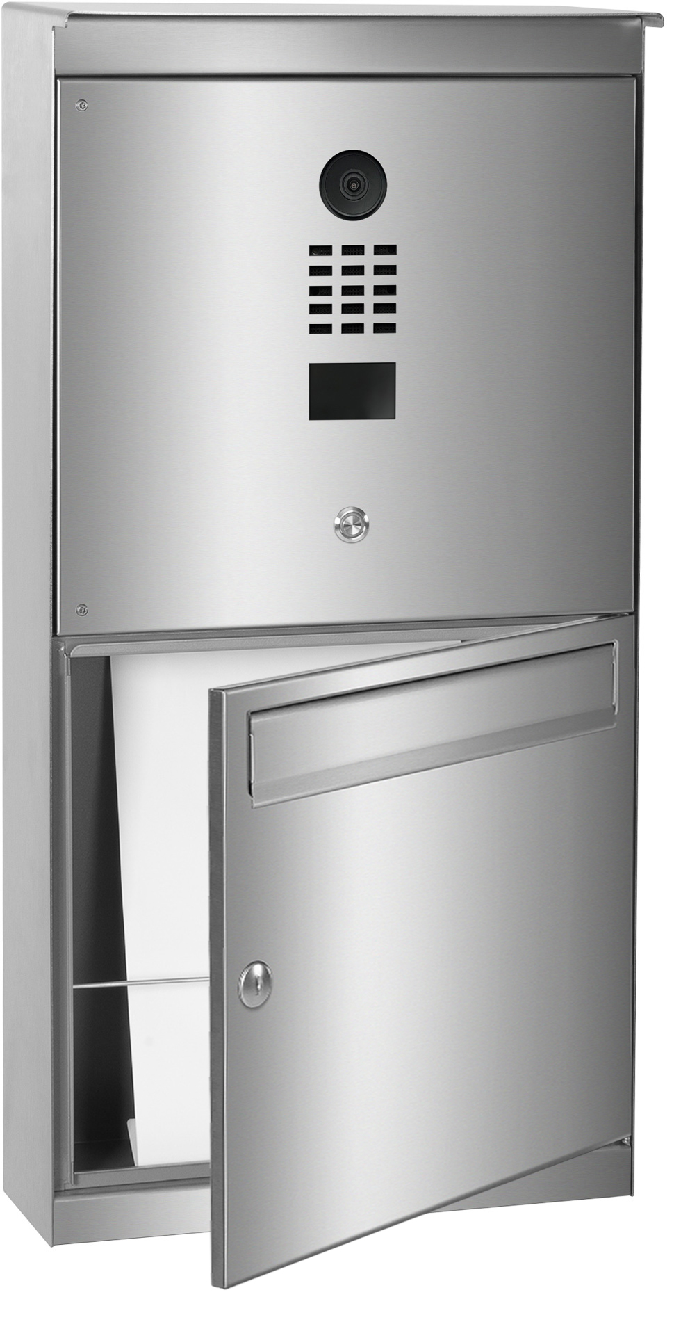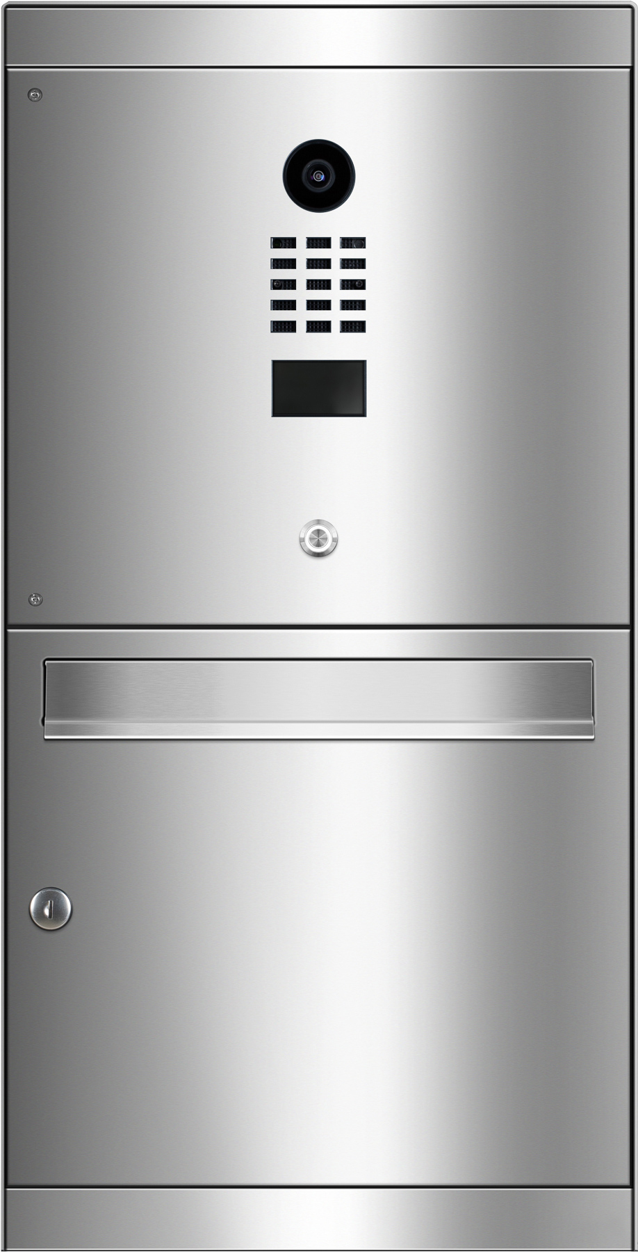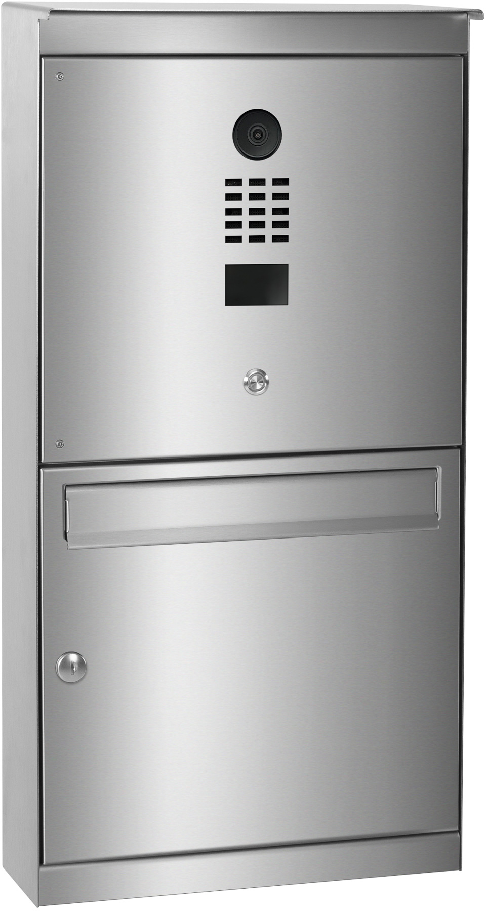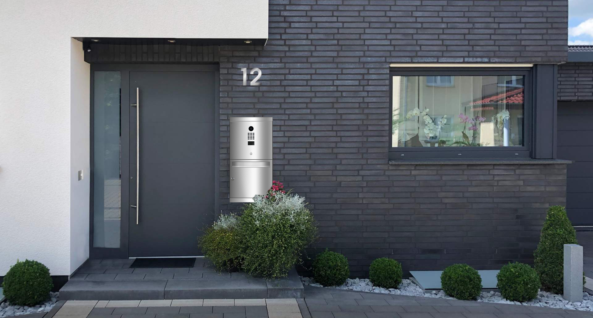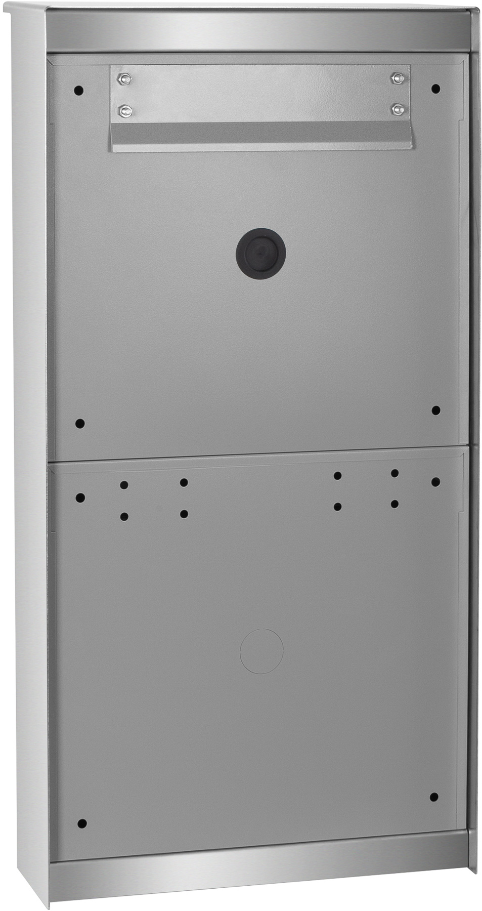 Der hochwertig verarbeitete Briefkasten AREVO mit integrierter DoorBird Videotechnik ist für die Aufputzmontage vorgesehen.