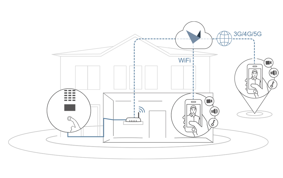 Via kostenloser DoorBird-App (Android/iOS) können Sie per Mobilgerät bei vorhandener Internetverbindung jederzeit auf die Türstation zugreifen – weltweit in Echtzeit. Sie sehen in HDTV-Auflösung, wer klingelt, und können mit der Person sprechen. Die Besucherhistorie zeichnet Bild, Datum und Uhrzeit auf, auch wenn der Besucher nicht klingelt, sondern per Bewegungssensor detektiert wurde (aktivierbare Zusatzfunktion).