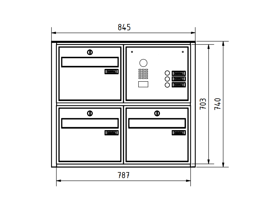 Jeder Briefkastenkorpus hat ein Maß von 390 x 340 x 100 mm (BxHxT), die Einwurfklappen sind je 325 x 35 mm (BxH) groß. Entnahmetüre und Einwurfklappe in 1,5mm starker Antivandalismus-Ausführung.