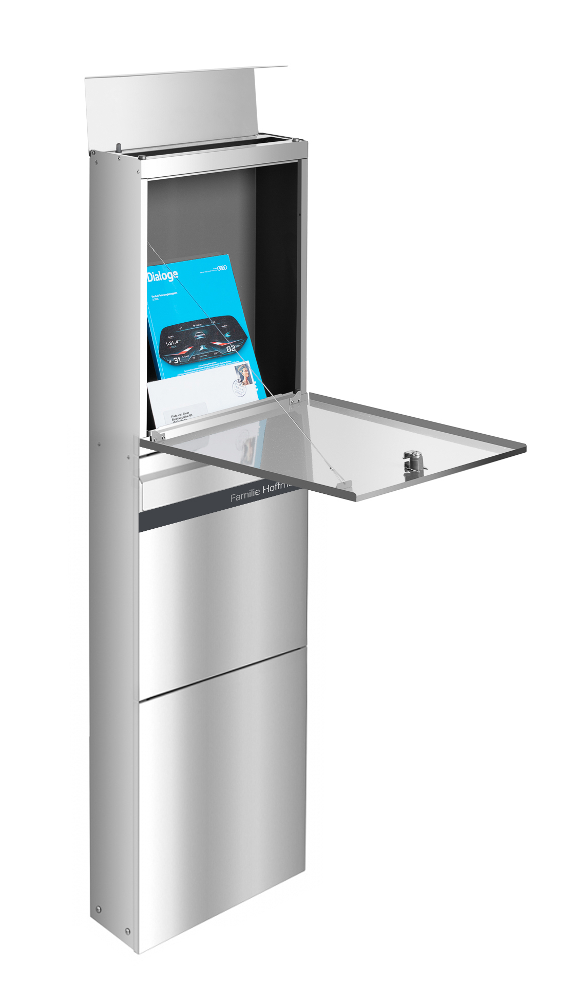 Der Design Standbriefkasten NAMUR wird aus hochwertigem Edelstahl gefertigt, ist ein absoluter Hingucker und ideal, wenn zwei Brieffächer benötigt werden. Er harmoniert durch seine klaren Linien und seine geradlinige Optik perfekt mit seiner Umgebung. Das moderne Design kombiniert mit hochwertigen Materialien und präziser Verarbeitung garantiert Ihnen lange Freude an diesem schönen Briefkasten. Das Schloss befindet sich witterungsgeschützt unterhalb unterhalb der Einwurfklappe. Der Einwurf erfolgt von oben, die Postentnahme erfolgt auf der Frontseite. Mit insgesamt 18,5 Litern Fassungsvermögen je Briefkastenfach bietet NAMUR viel Platz für Ihre Post sowie Zeitungen und Zeitschriften.