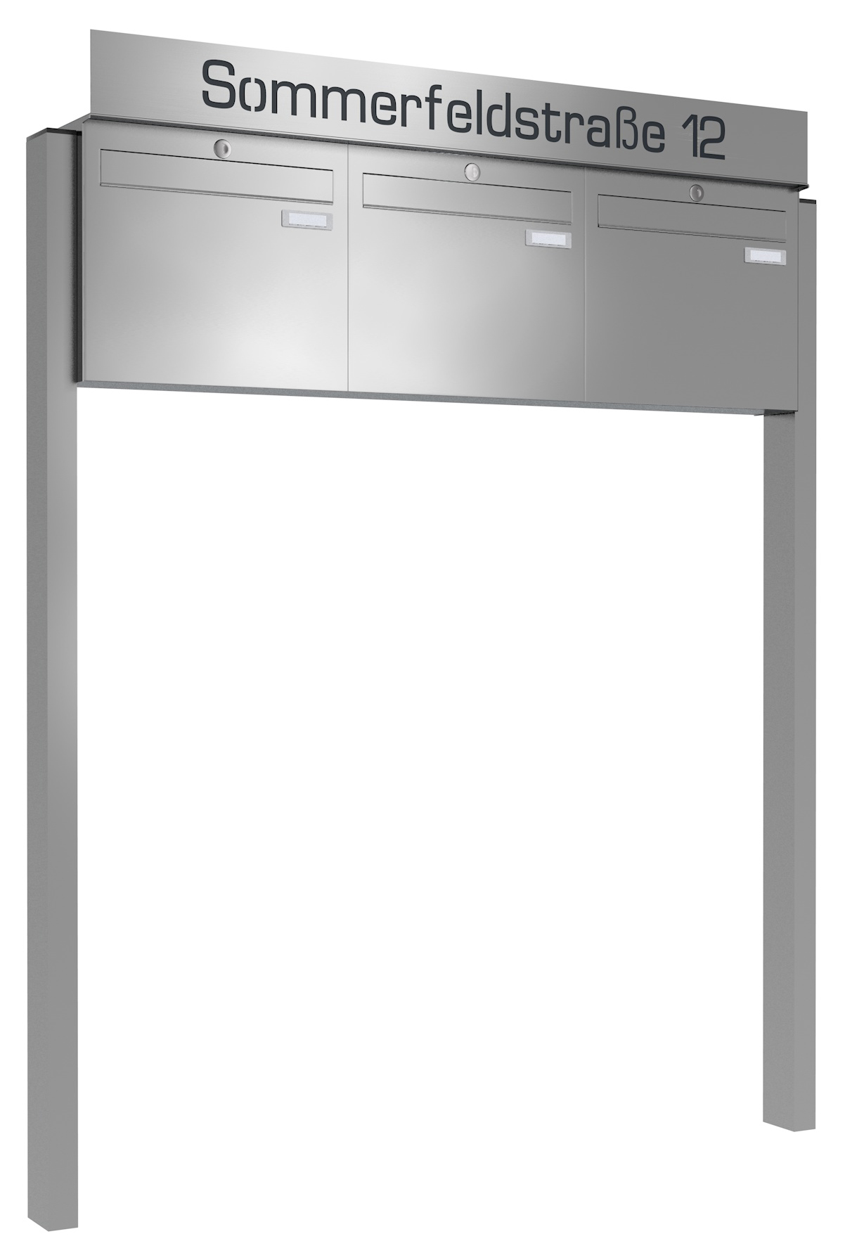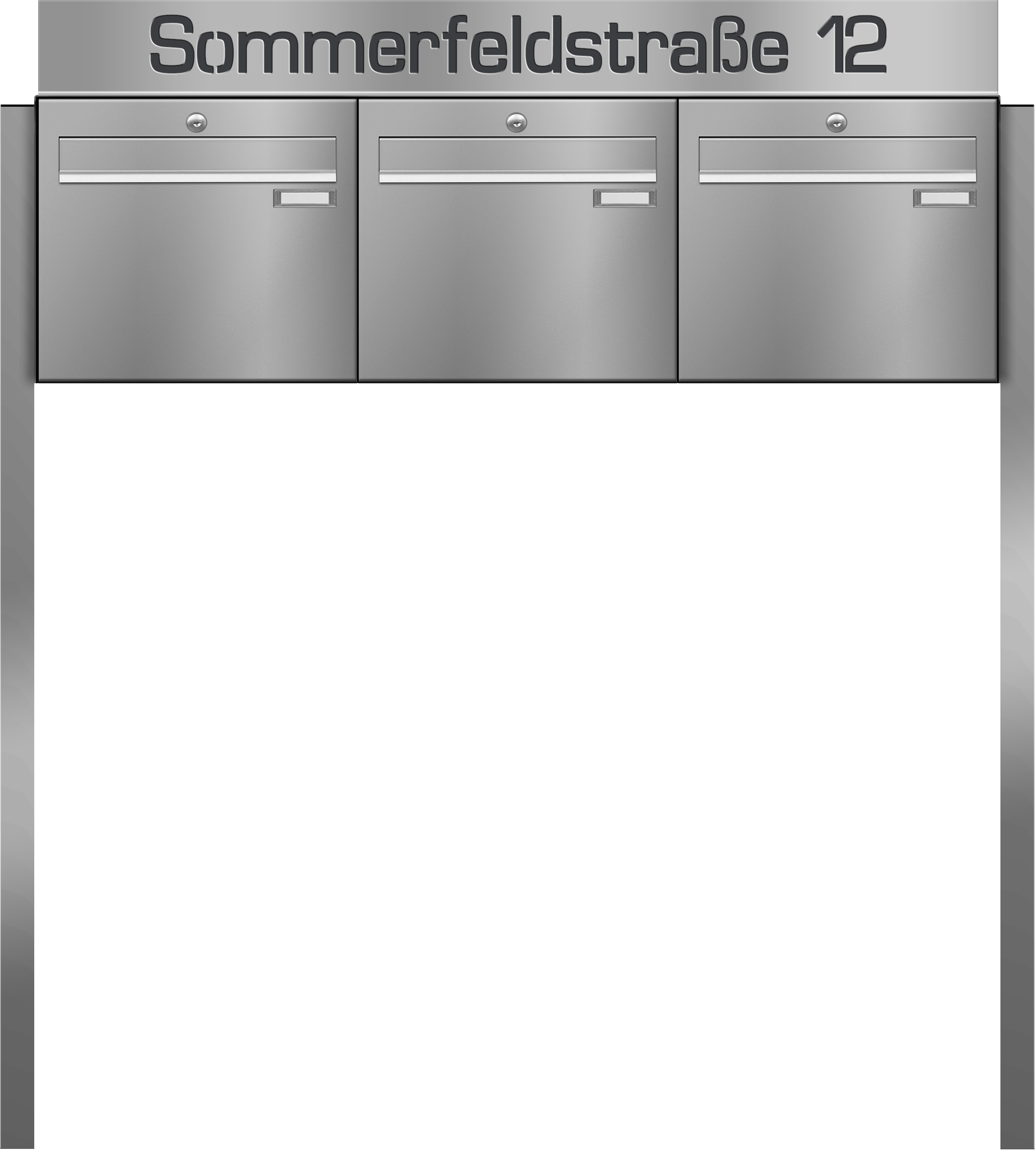 Bei der ®frabox-Lasercut 7-Beschriftung wird durch einen Präzisionslaser das Edelstahl ausgeschnitten und anschließend eine in RAL 7016 anthrazitgrau lackierte Metallplatte hinter der Laserschrift angebracht. So entsteht ein edler, einzigartiger 3D-Effekt für die Darstellung des Straßennamens und / oder der Hausnummer oberhalb der Briefkastenanlage.