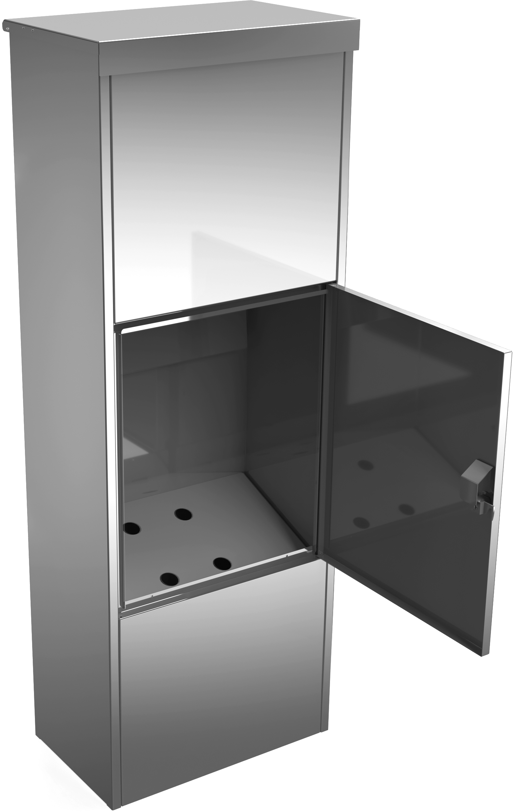 Für eine flexible Nutzung kann der im Kasten befindliche Zwischenboden bei Bedarf entfernt werden, um das Volumen zu vergrößern. Dadurch kann der Venovos vollständig für die Aufbewahrung von Post genutzt werden. Die Post- und Paketentnahme erfolgt über eine abschließbare Drehtür, die zusätzliche Sicherheit bietet.