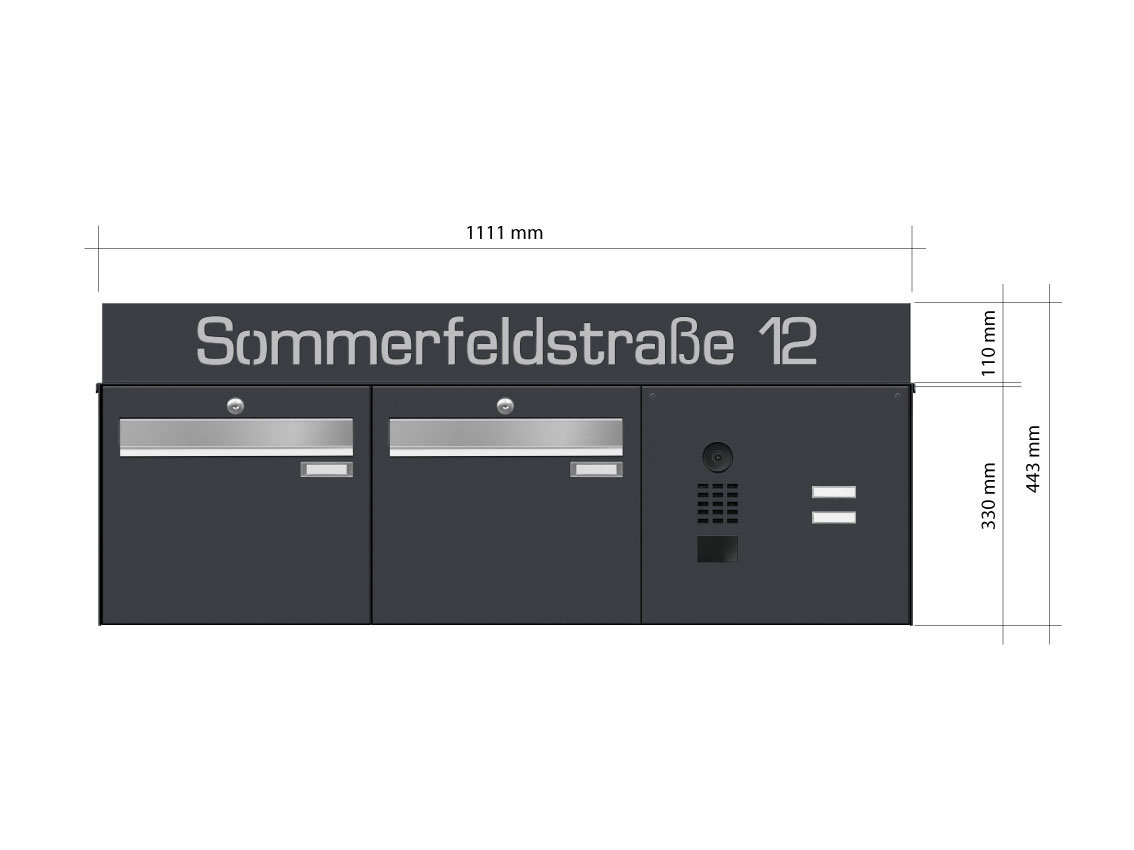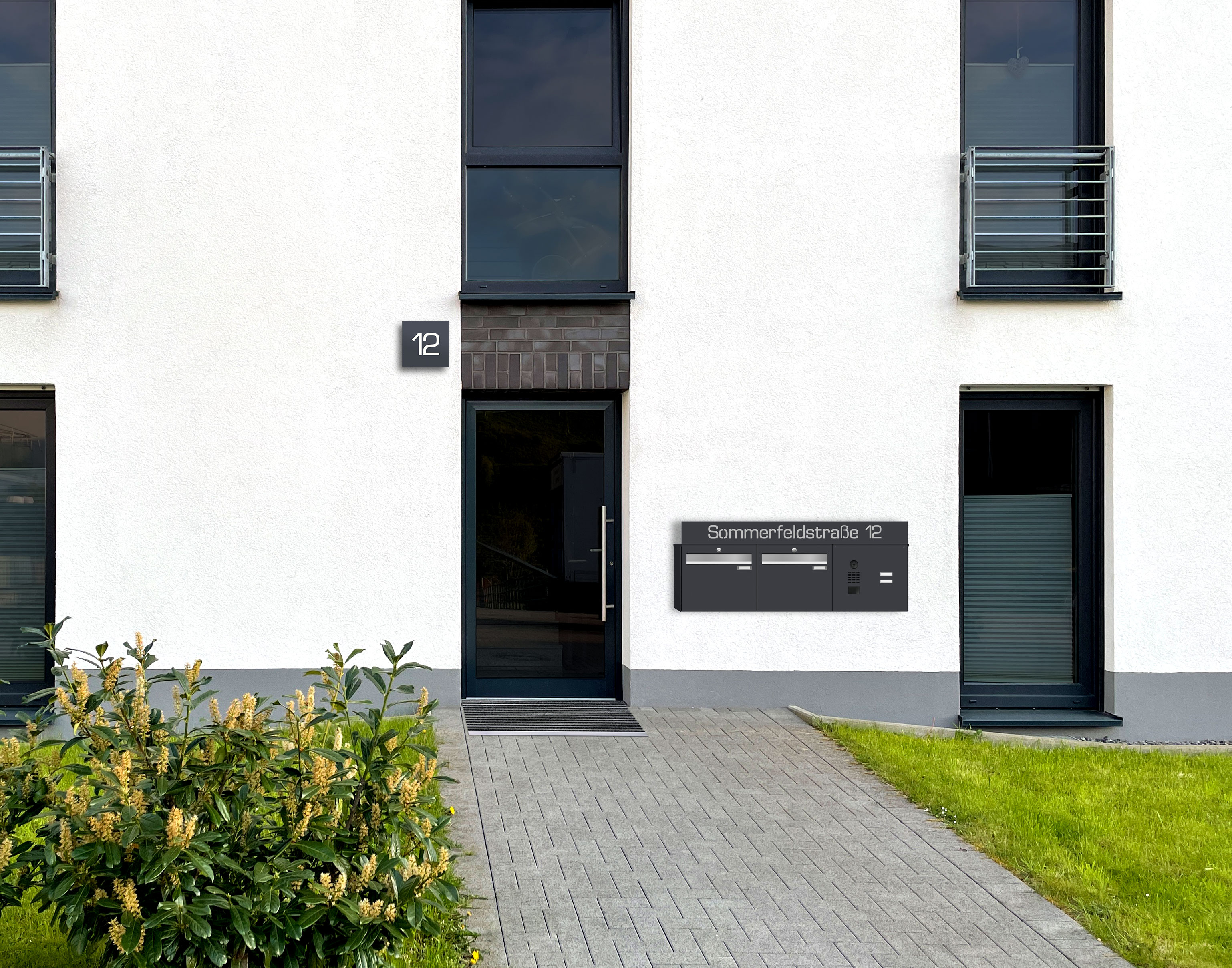 Bei der ®frabox-Lasercut 7-Beschriftung wird durch einen Präzisionslaser das verzinkte Stahlblech erst ausgeschnitten und anschließend lackiert. Danach wird eine Edelstahlplatte hinter der Laserschrift angebracht - so entsteht ein edler, einzigartiger 3D-Effekt für die Darstellung des Straßennamens und / oder der Hausnummer oberhalb der Briefkastenanlage.