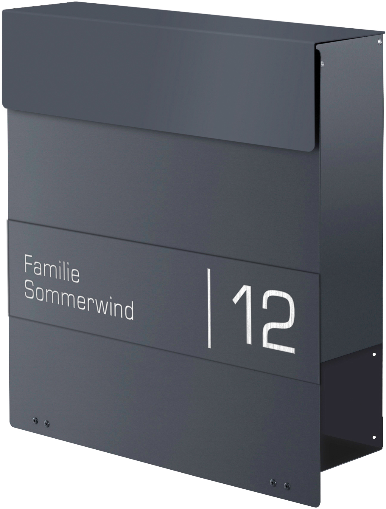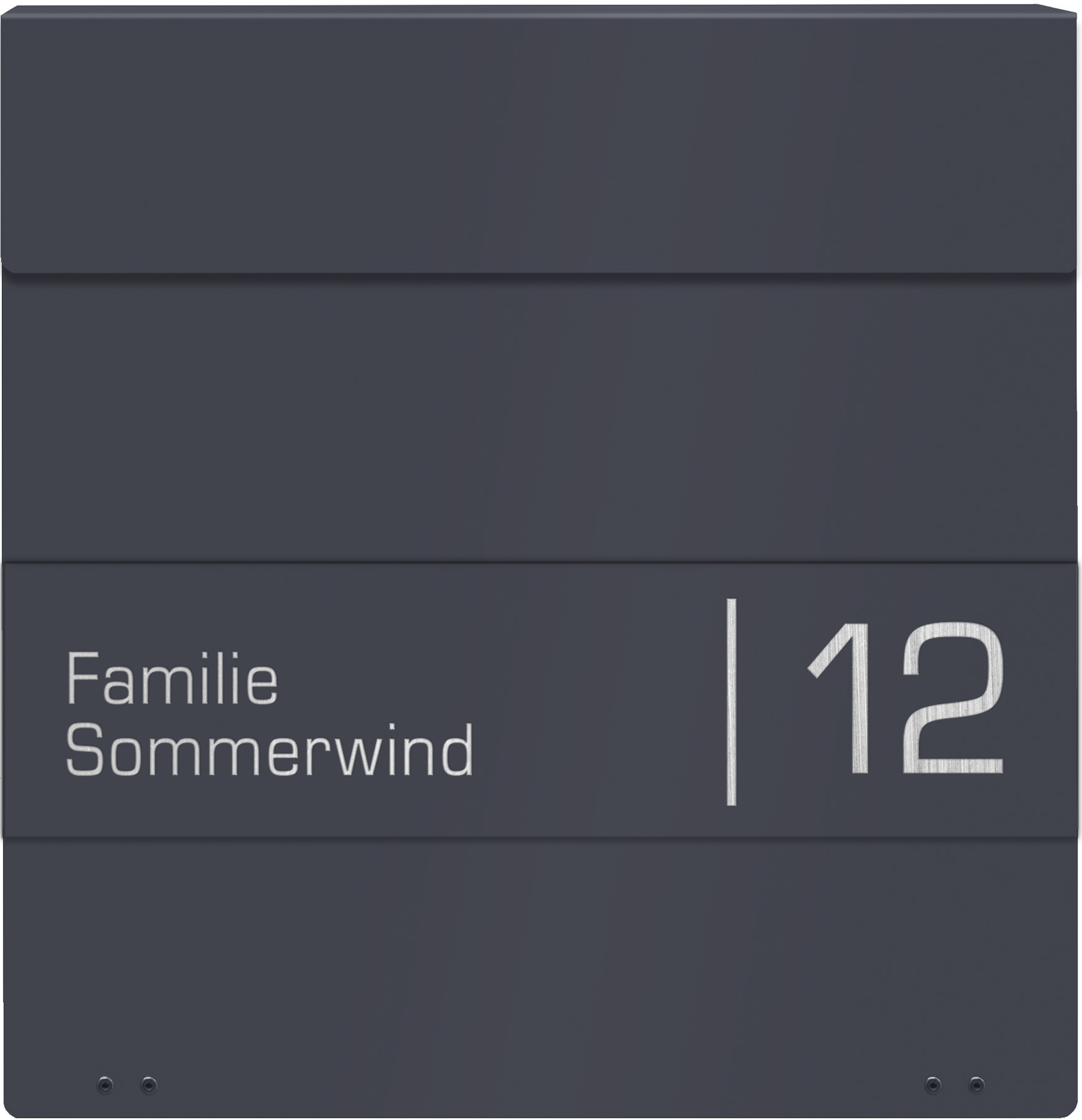Bei der Frabox® Lasergravur wird Ihr Name und Ihre Hausnummer aus der lackierten anthrazitfarbenen Namensschildplatte ausgelasert, wodurch der Edelstahluntergrund zum Vorschein kommt. Anschließend wird die Namensschildplatte mithilfe von speziell entwickelten Schablonen millimetergenau angebracht. Dieser Vorgang erfordert besondere Sorgfalt seitens erfahrener Mitarbeiter, um ein perfektes Ergebnis zu erzielen.