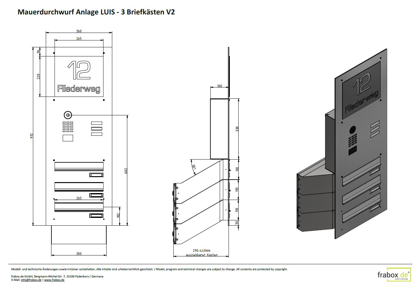 Jeder Briefkasten hat die Maße 300 x 110 x 290 – 440 mm (B x H x T). Die Tiefe der Kästen ist variabel von 290 bis 440 mm und passt sich so optimal Ihrer Mauerstärke an (30 Grad Winkel schräg nach hinten). Die Einwurfklappe misst 265 x 35 mm (B x H).