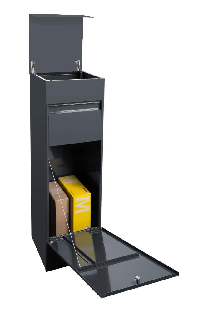 Der Design Paketkasten NAMUR wird aus verzinktem, lackiertem Stahl gefertigt und ist ein wahres Design Kunstwerk: Er harmoniert durch seine klaren Linien und seine geradlinige Optik perfekt mit seiner Umgebung. Das moderne Design kombiniert mit hochwertigen Materialien und präziser Verarbeitung garantiert Ihnen lange Freude an diesem schönen Paketkasten. Das Schloss befindet sich witterungsgeschützt unterhalb der Einwurfklappe. Die massive Einwurfklappe schließt durch die eingebaute Gasdruckfeder sanft. Der Einwurf erfolgt von oben, die Paketentnahme erfolgt auf der Frontseite. Mit insgesamt 66 Litern Fassungsvermögen bietet NAMUR viel Platz für Ihre Pakete.