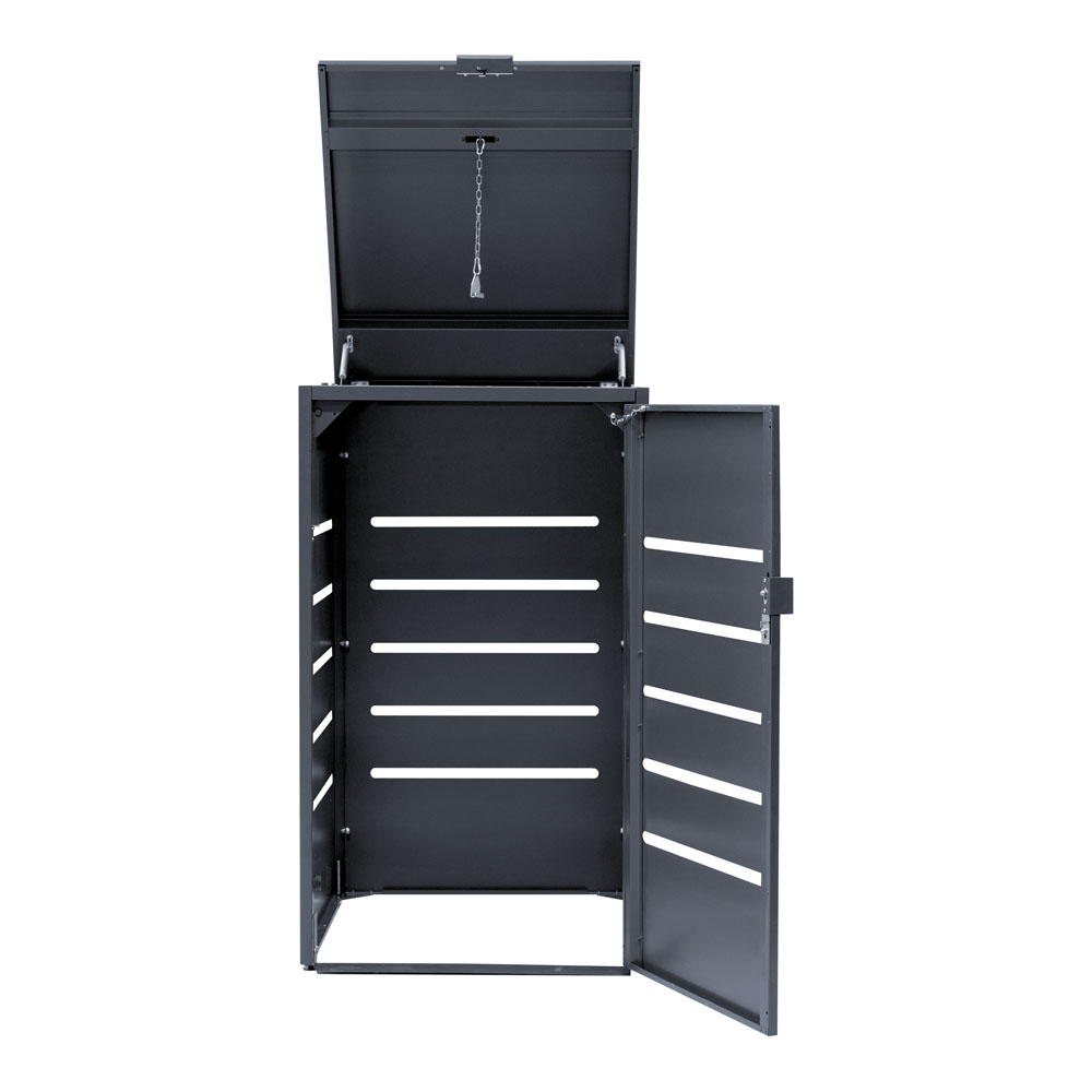 Die Box eignet sich für handelsübliche 240-Liter-Mülltonnen und passt auch für kleinere 120-Liter-Modelle. Beim Öffnen hebt sich automatisch auch der Deckel der Tonne, was die Entsorgung besonders komfortabel macht. Dank seitlicher Belüftungsschlitze bleibt die Luftzirkulation gewährleistet und Gerüche werden reduziert.
