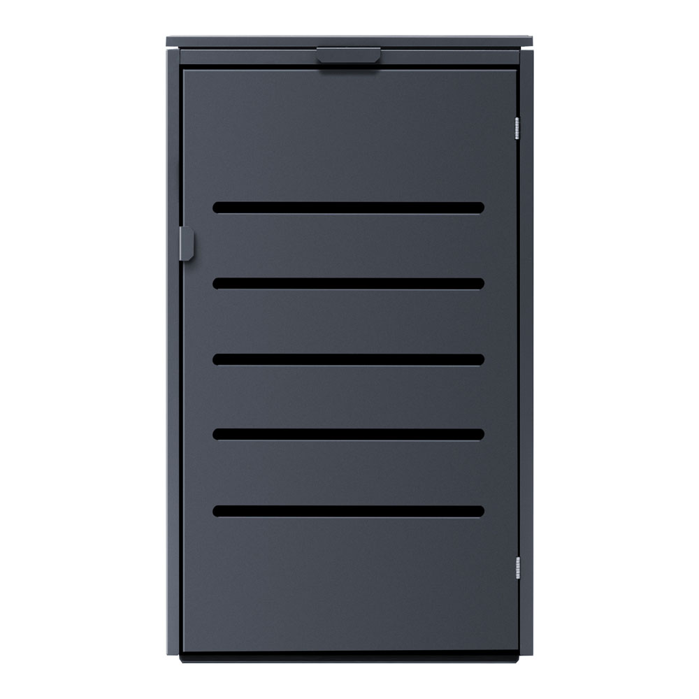 Die Mülltonnenbox bringt Ordnung und Stil in Ihren Außenbereich. Sie verstaut Ihre Mülltonne dezent, sicher und wetterfest und sorgt so für ein gepflegtes Erscheinungsbild vor dem Haus. Gefertigt aus pulverbeschichtetem Aluminium in RAL 7016 Anthrazitgrau Feinstruktur matt, überzeugt sie mit moderner Optik, hoher Stabilität und Langlebigkeit. Das schräge Dach leitet Regenwasser zuverlässig ab, und Gasdruckdämpfer sorgen für ein sanftes, geräuschloses Öffnen und Schließen – kein Klappern, kein Zuschlagen.