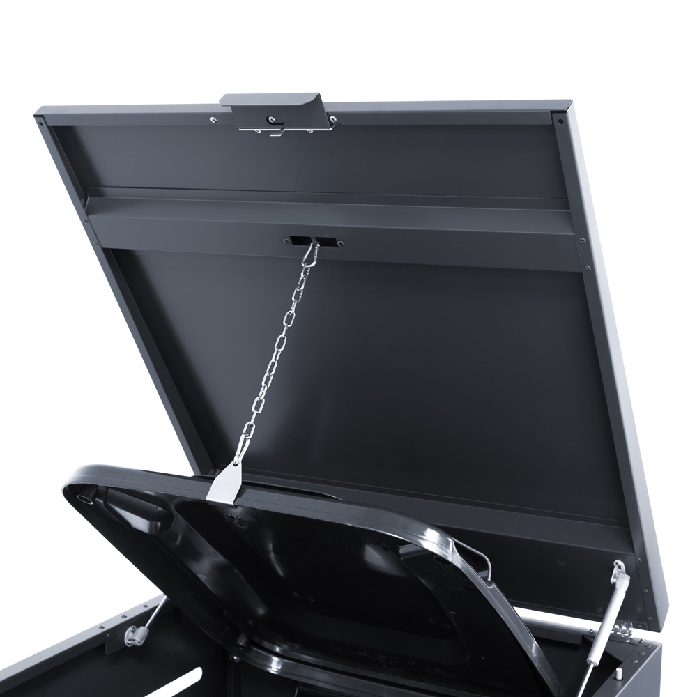 Die Box eignet sich für handelsübliche 240-Liter-Mülltonnen und passt auch für kleinere 120-Liter-Modelle. Beim Öffnen hebt sich automatisch auch der Deckel der Tonne, was die Entsorgung besonders komfortabel macht. Dank seitlicher Belüftungsschlitze bleibt die Luftzirkulation gewährleistet und Gerüche werden reduziert.