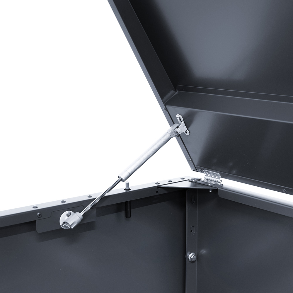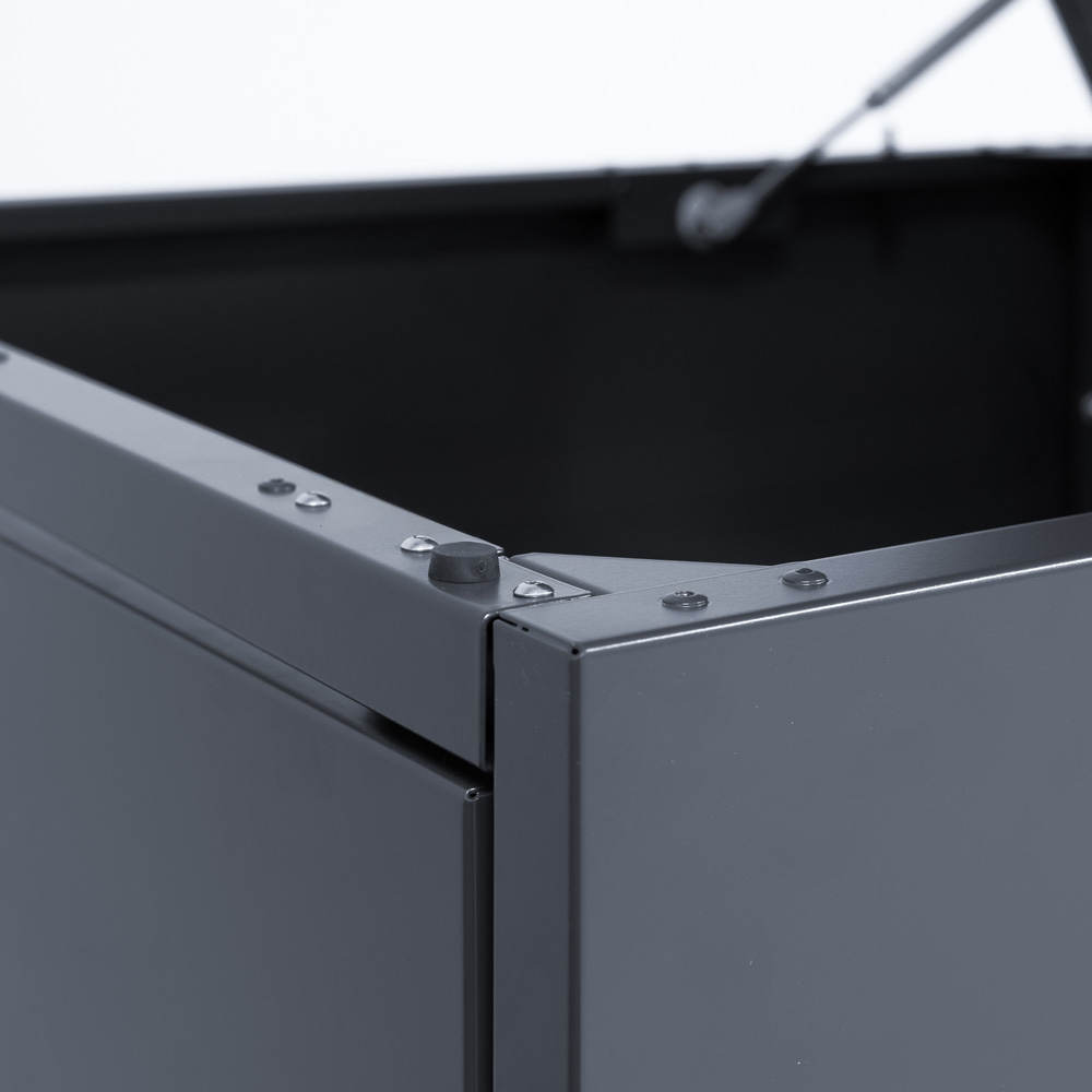 Die Mülltonnenbox bringt Ordnung und Stil in Ihren Außenbereich. Sie verstaut Ihre Mülltonne dezent, sicher und wetterfest und sorgt so für ein gepflegtes Erscheinungsbild vor dem Haus. Gefertigt aus pulverbeschichtetem Aluminium in RAL 7016 Anthrazitgrau Feinstruktur matt, überzeugt sie mit moderner Optik, hoher Stabilität und Langlebigkeit. Das schräge Dach leitet Regenwasser zuverlässig ab, und Gasdruckdämpfer sorgen für ein sanftes, geräuschloses Öffnen und Schließen – kein Klappern, kein Zuschlagen.