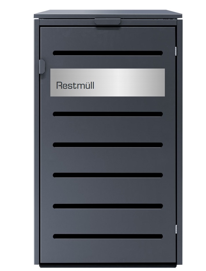 Optional kann die Front mit einer Lasercut-Edelstahlapplikation versehen werden, beispielsweise mit Ihrer Adresse, Hausnummer oder einer Beschriftung wie „Papier und Pappe“.