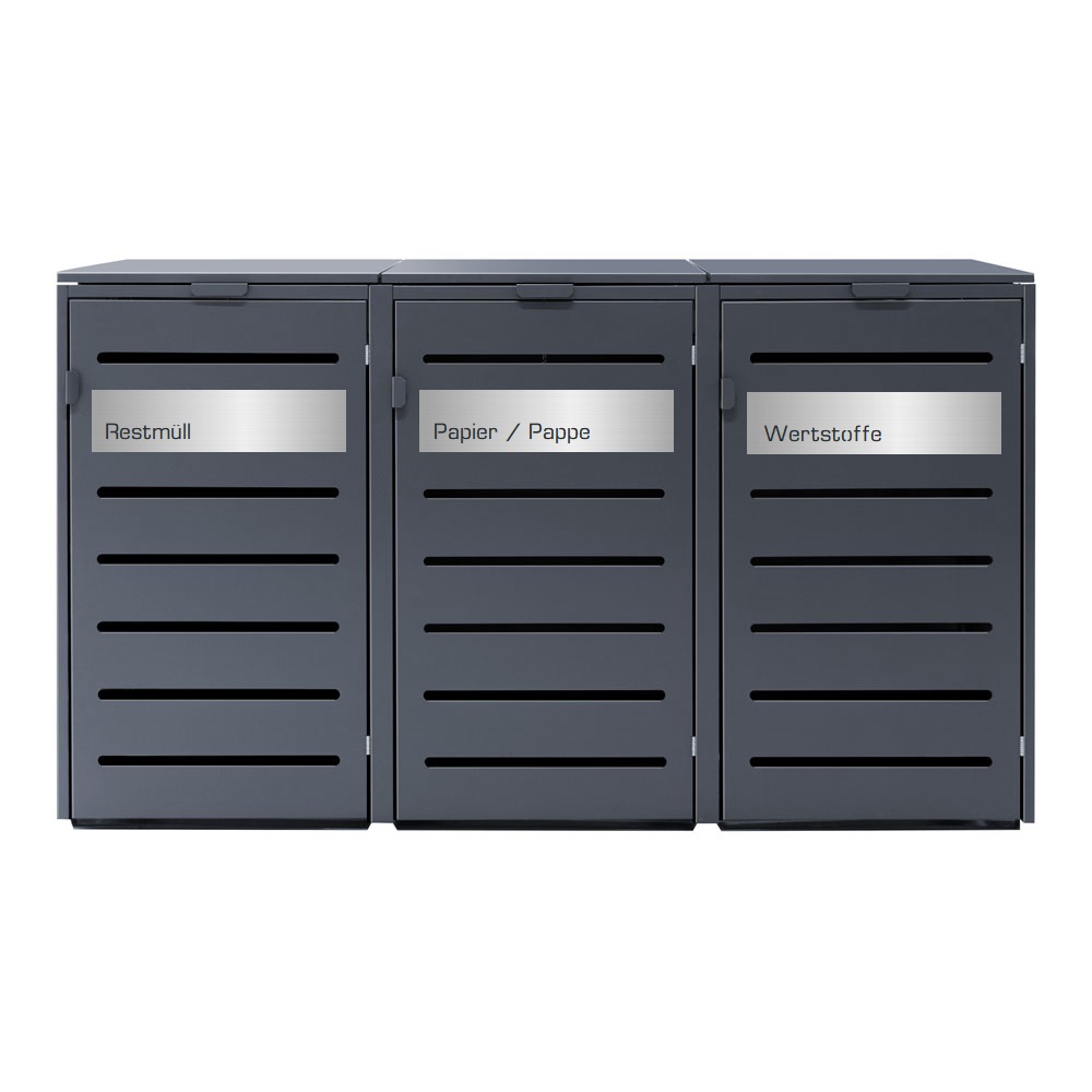 Optional kann die Front mit einer Lasercut-Edelstahlapplikation versehen werden, beispielsweise mit Ihrer Adresse, Hausnummer oder einer Beschriftung wie „Papier und Pappe“.