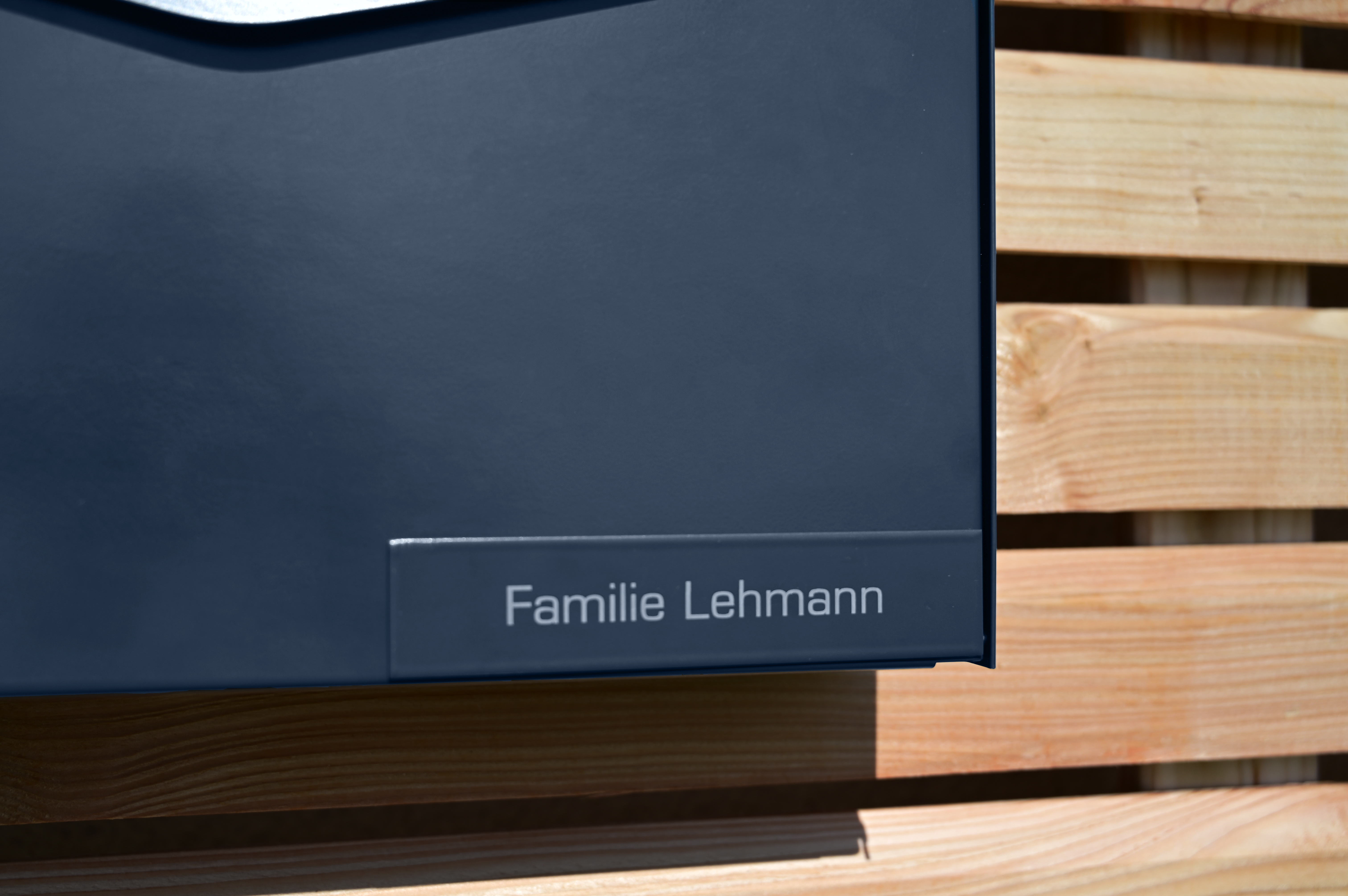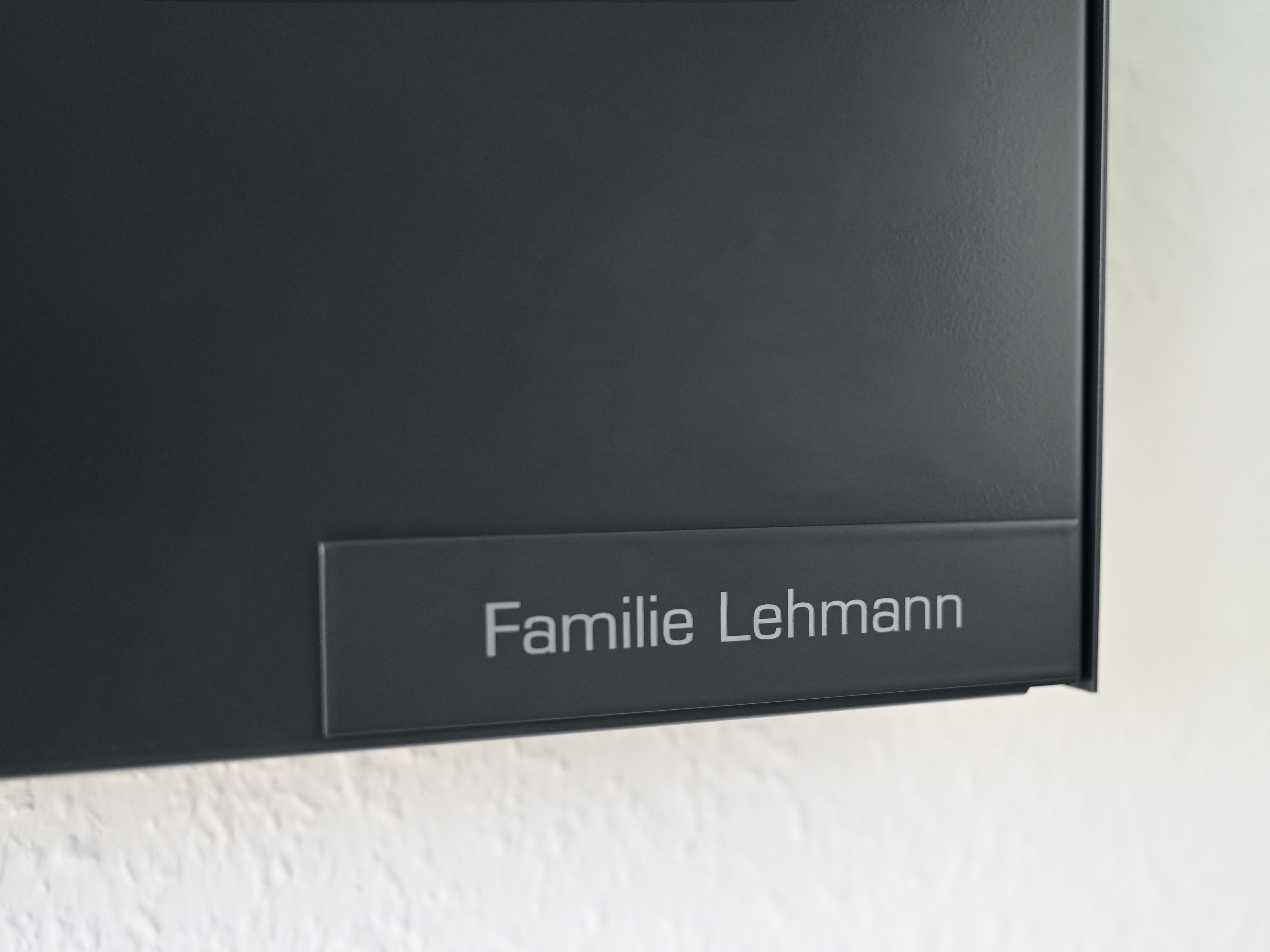 Bei der Frabox® Lasergravur wird Ihr Name und Ihre Hausnummer aus der lackierten Namensschildplatte ausgelasert, wodurch der Edelstahluntergrund zum Vorschein kommt. Die gravierte Namensschildplatte wird separat mitgeliefert und kann so flexibel an der gewünschten Position angebracht werden.