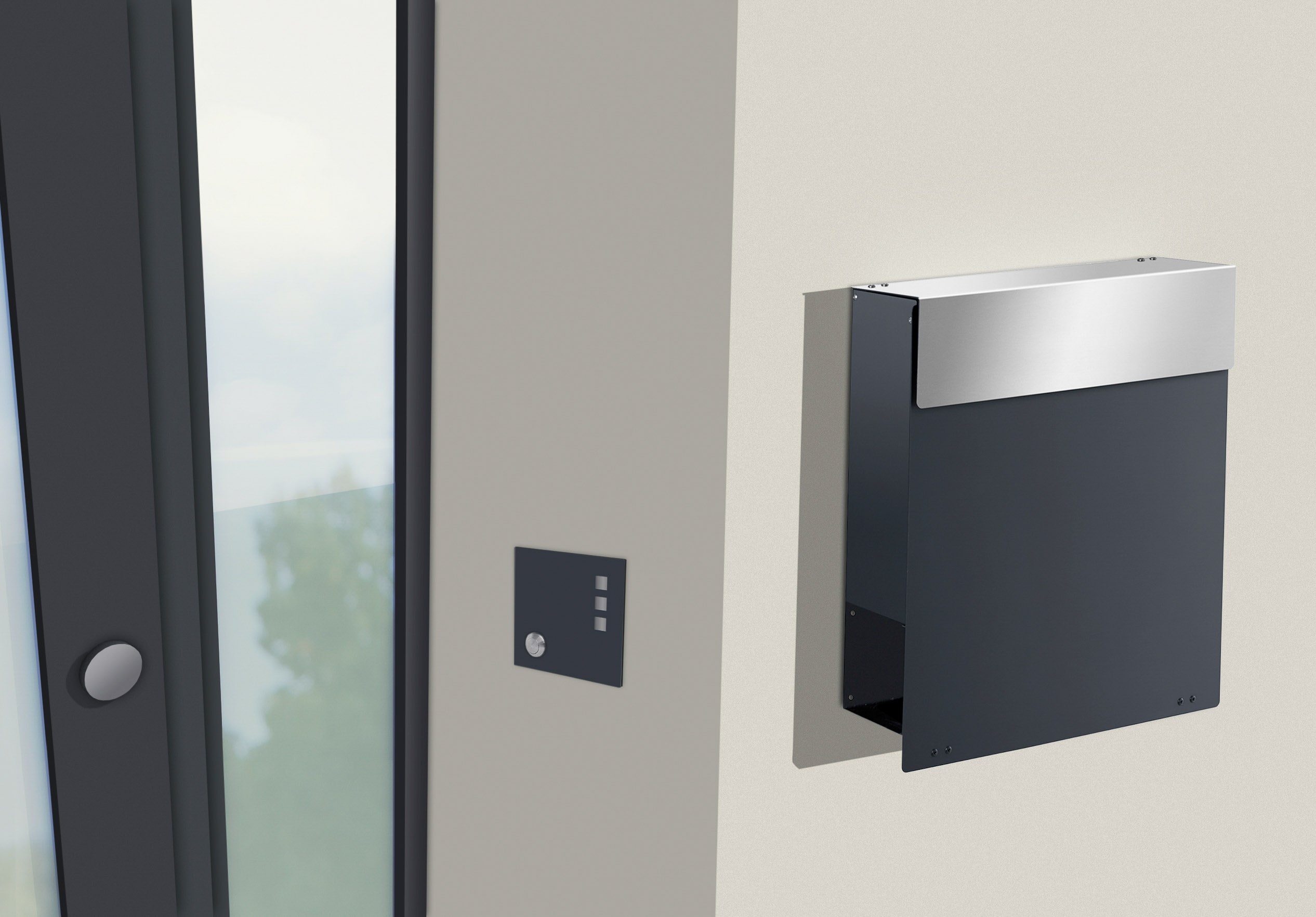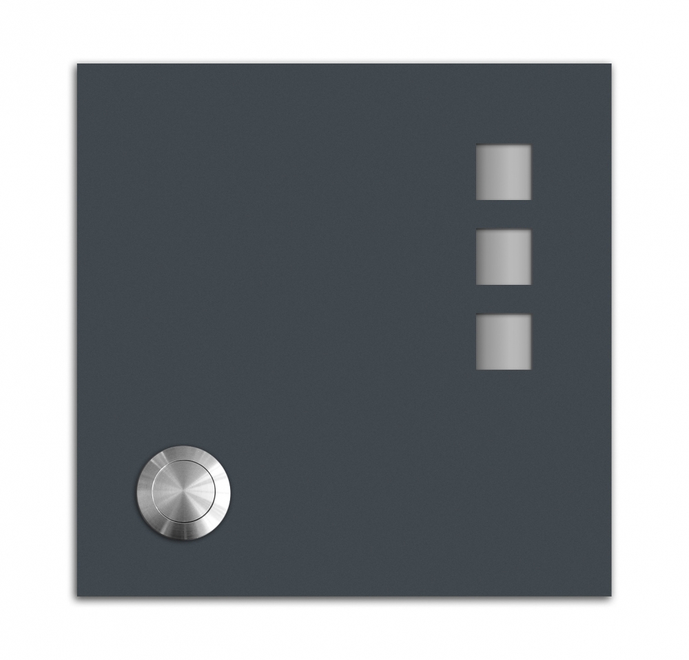 Diese schlichte und zugleich formschöne Klingelplatte fügt sich nahtlos an jede Hausfassade. Hochwertig in Aluminium RAL 7016 anthrazitgrau pulverlackiert gefertigt. Die drei quadratischen Felder sind mit Edelstahl hinterlegt und erzeugen dadurch einen edlen Kontrast zum anthrazitgrau. Die Montage erfolgt einfach durch Einbringung der mitgelieferten Dübel in das Mauerwerk, dann werden die beiliegenden Bolzen rückwärtig in die Platte geschraubt und das Element so in die Dübel "eingeschlagen". So erreichen Sie eine optimale und sichere Befestigung.