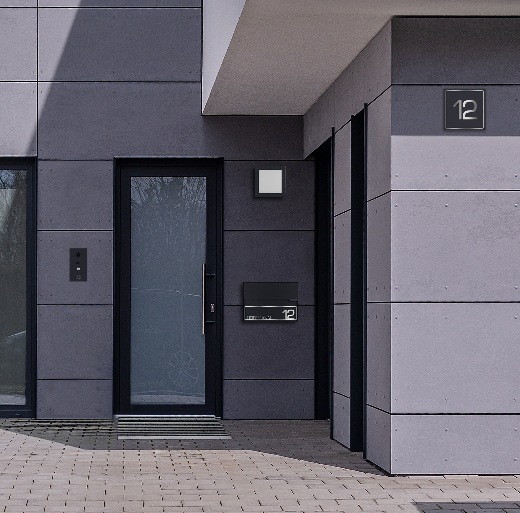 Das Hausnummernschild Lumers harmoniert besonders gut mit den Frabox-Briefkästen.