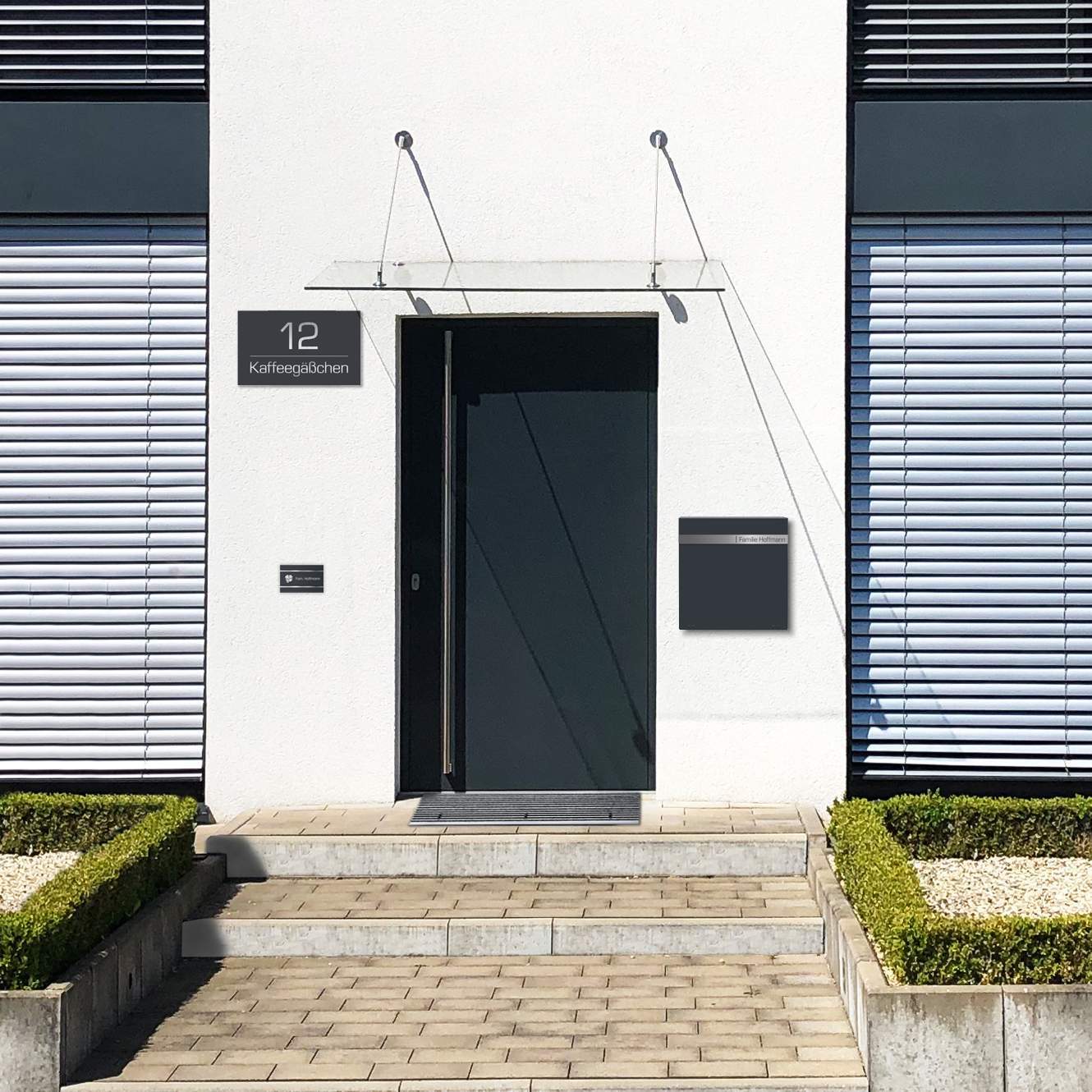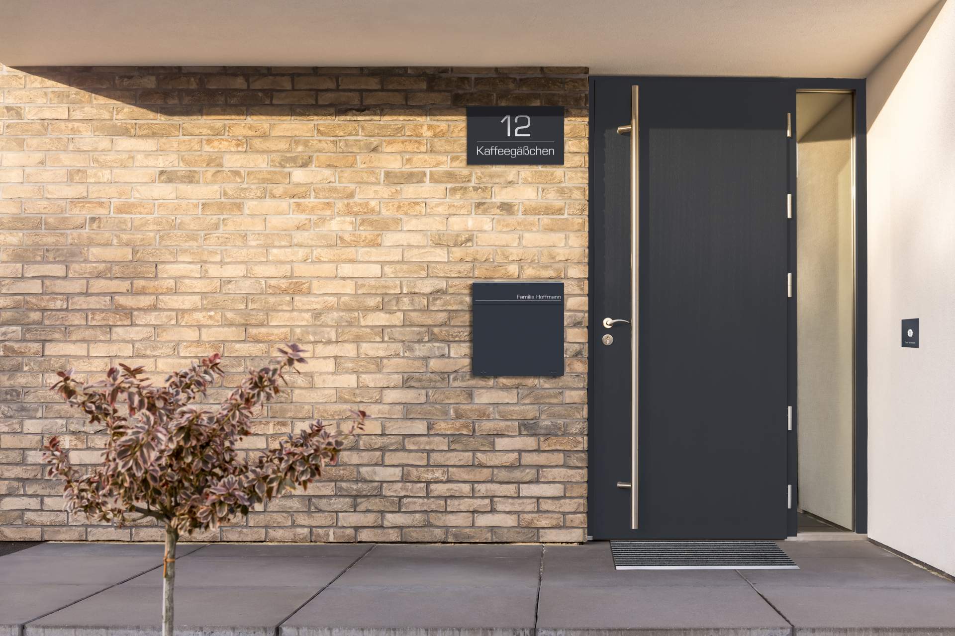 Das Hausnummernschild Lumers harmoniert besonders gut mit den Frabox-Briefkästen.