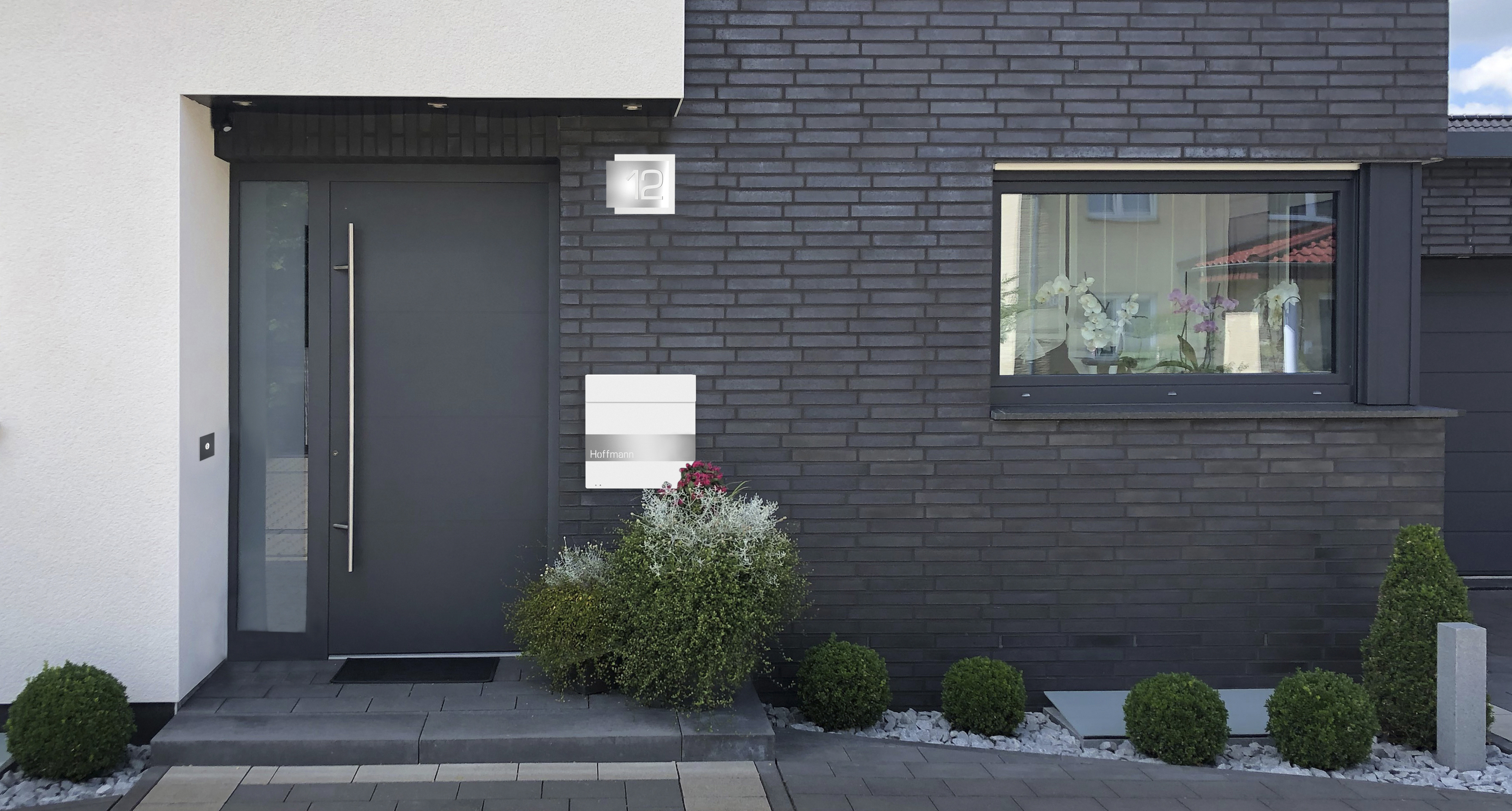 Das Hausnummernschild SHAPE harmoniert besonders gut mit den Frabox-Briefkästen.